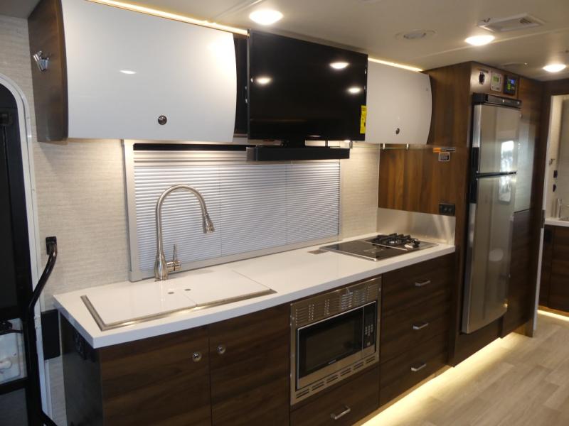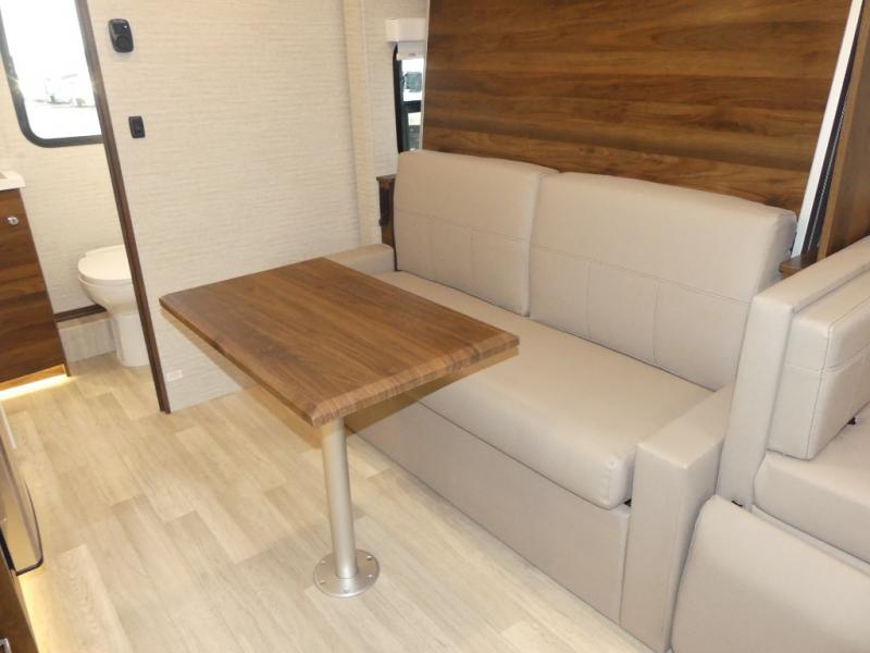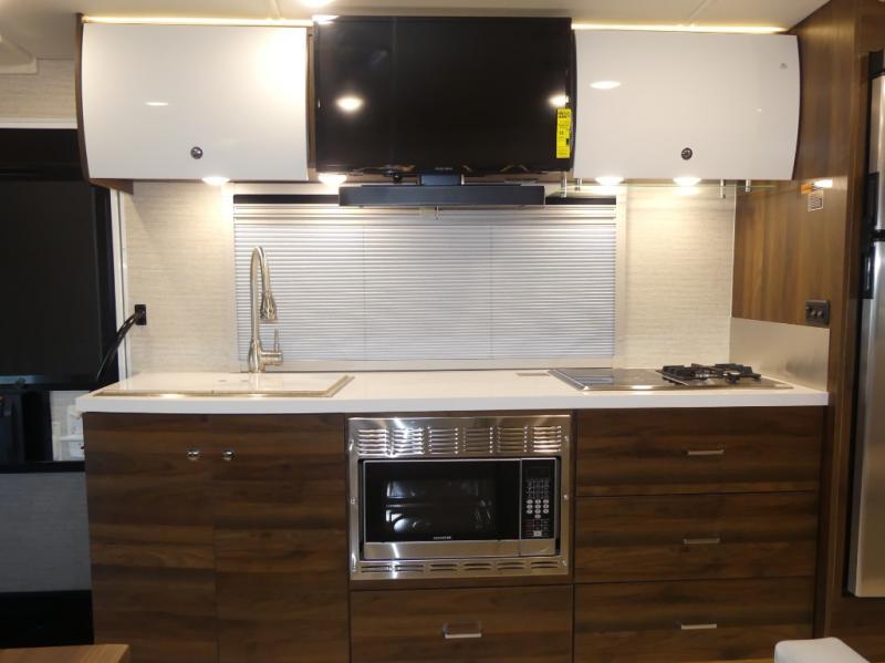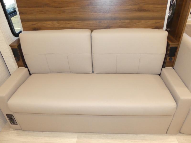 This family-friendly coach offers sleeping space for six when you utilize the Murphy Bed, the cabover bunk and the U-shaped dinette with footrests as sleeping space! If you're not needing the extra sleeping space, just choose the optional theater seating in place of the dinette. During the day, the sofa easily replaces the Murphy bed so you can dine at the pedestal table that you grabbed from the front area's location. The heated power control cab seats include armrests, adjustable lumbar support, headrest, recline, slide and manual swivel functions giving you ultimate comfort on the road and while at your RV spot. The cook will love having a galley kitchen with a microwave/convection oven and 12V compressor-driven refrigerator/freezer to keep everyone fed.