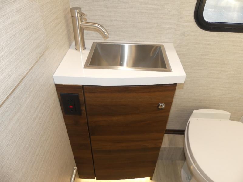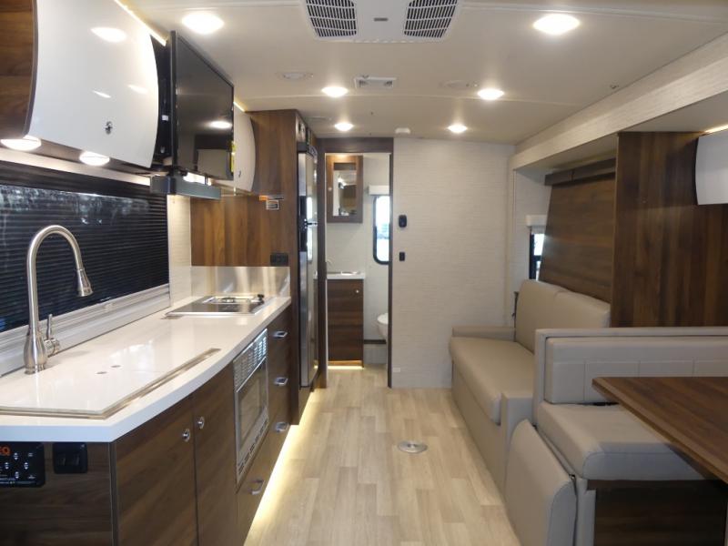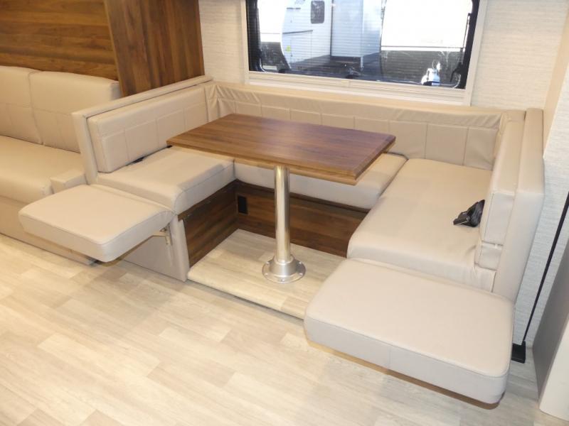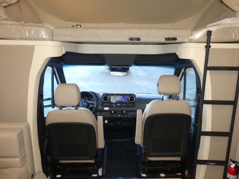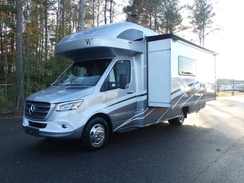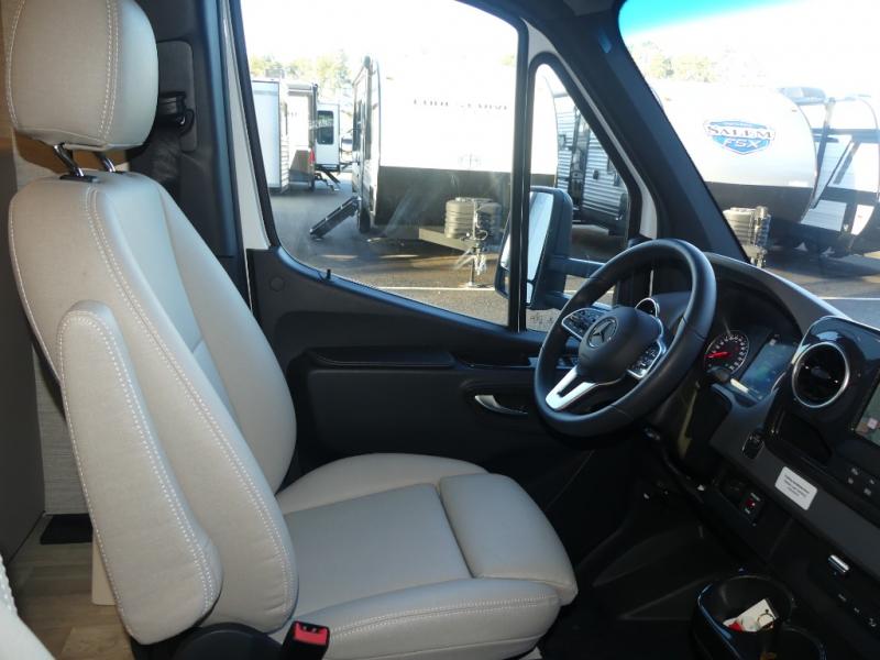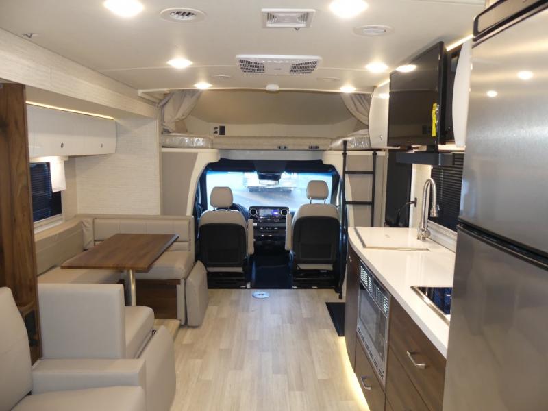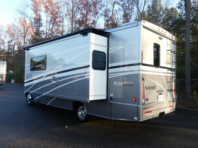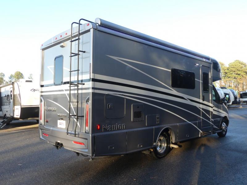With the Winnebago Navion Class C diesel motorhome, campsite setup is made easier with a powered patio awning with LED lights and Bluetooth control that you can control with a smartphone app, a slide out that is easily moved outward with a push of a button, and your sleeping accommodations are flexible with your activities. The Mercedes-Benz RWD Sprinter chassis, turbo-diesel engine, Adaptive ESP technology, and hydraulic brakes with ABS, are a few reasons you will love driving this coach anywhere, plus all the cab conveniences. The interior offers laminate countertops and vinyl flooring throughout for easy care, cabinets with accent lighting, toe kick lighting to help when your hands are full, and charging stations for your electronics. You will stay powered up with two 100-watt solar panels, a 3,600-watt Cummins Onan MicroQuiet LP generator, a 2,000-watt pure sine wave inverter, plus more features included with the electrical system.