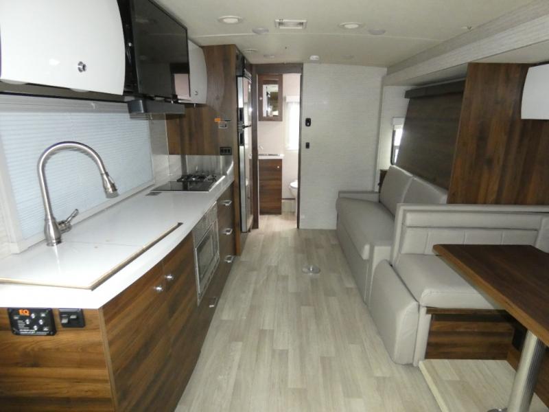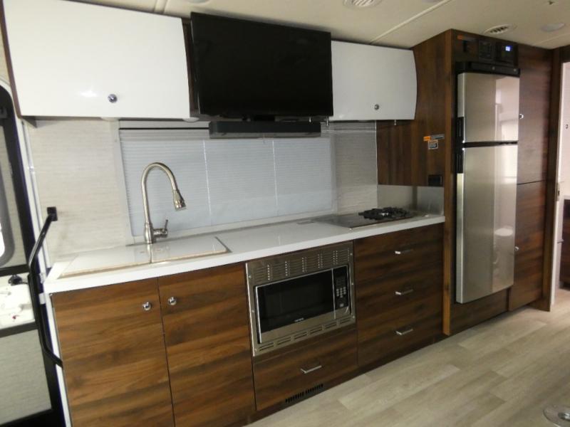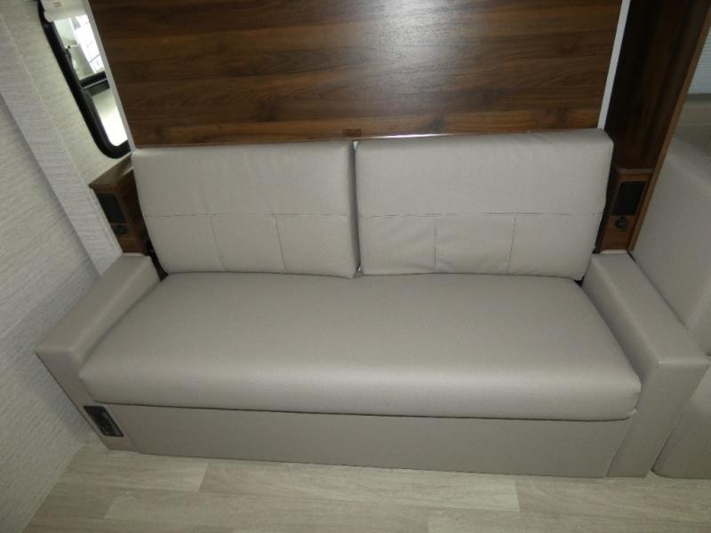 This family-friendly coach offers sleeping space for six when you utilize the Murphy Bed, the cabover bunk and the U-shaped dinette with footrests as sleeping space! If you're not needing the extra sleeping space, just choose the optional theater seating in place of the dinette. During the day, the sofa easily replaces the Murphy bed so you can dine at the pedestal table that you grabbed from the front area's location. The heated power control cab seats include armrests, adjustable lumbar support, headrest, recline, slide and manual swivel functions giving you ultimate comfort on the road and while at your RV spot. The cook will love having a galley kitchen with a microwave/convection oven and 12V compressor-driven refrigerator/freezer to keep everyone fed.