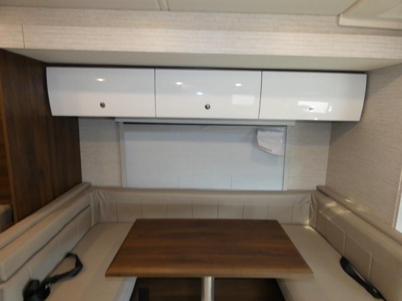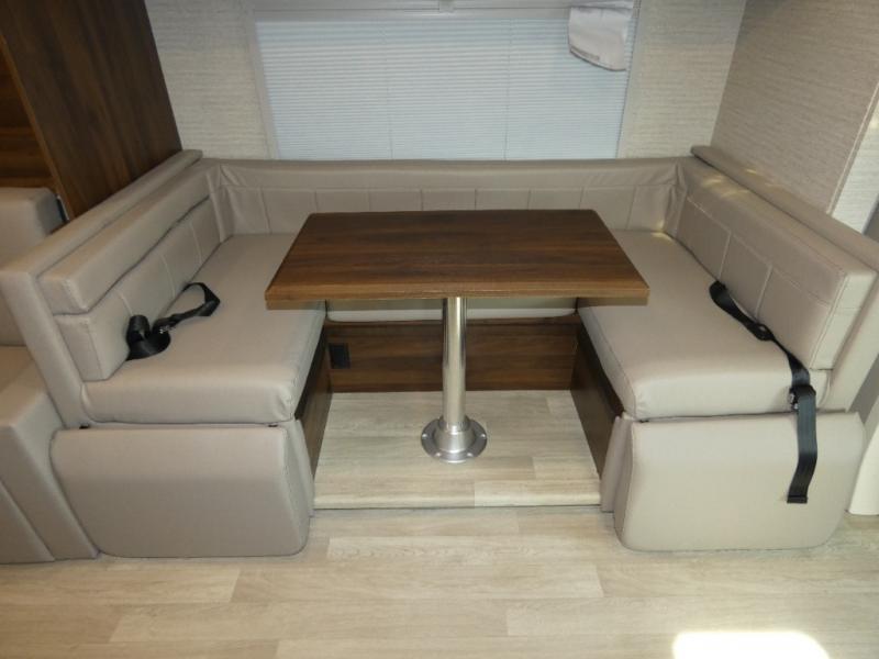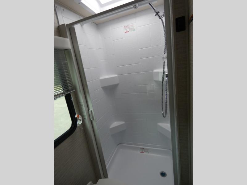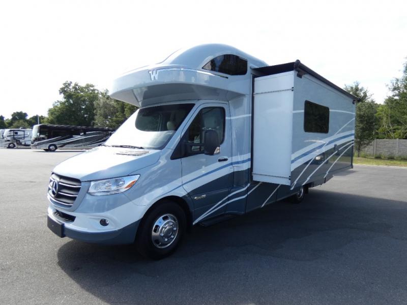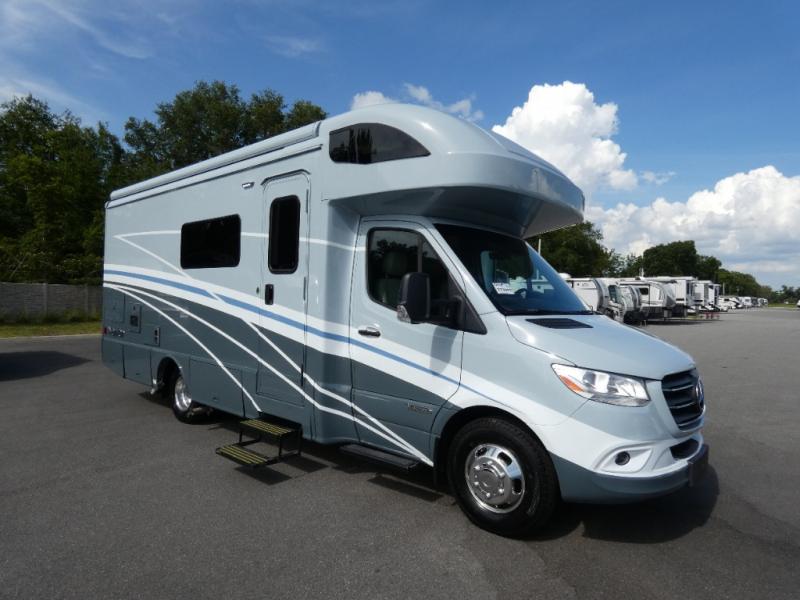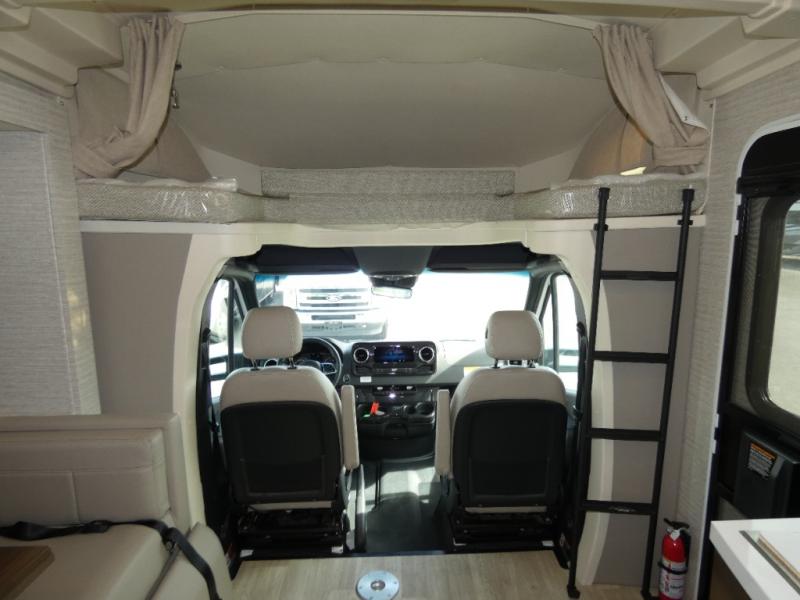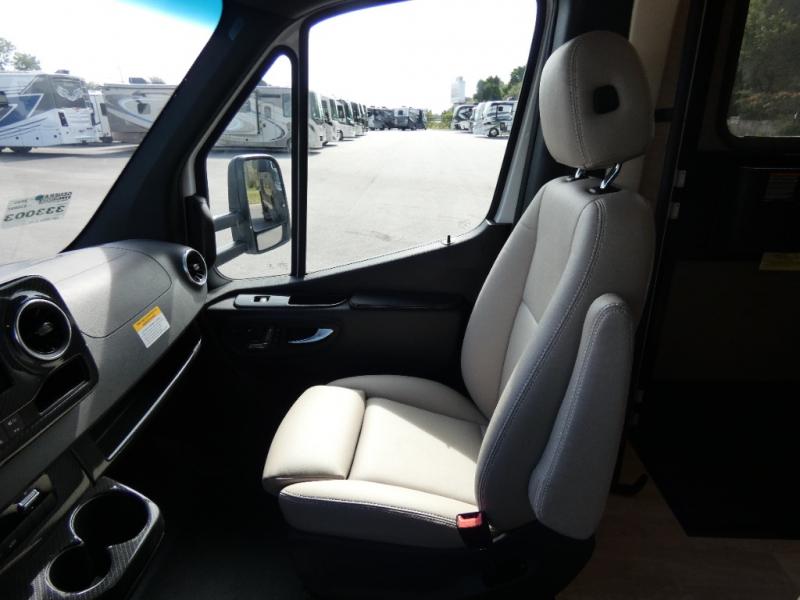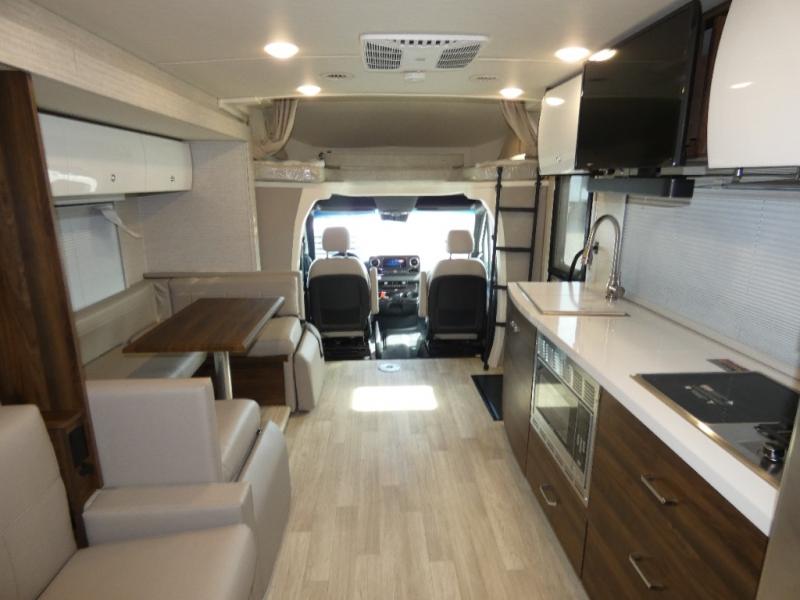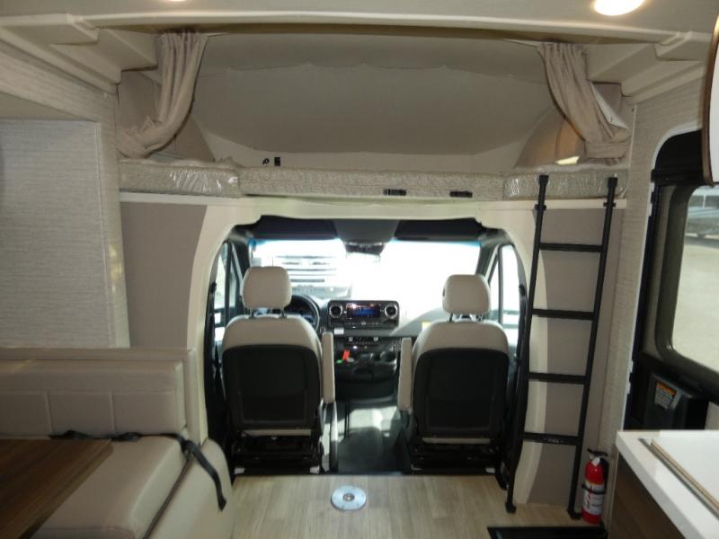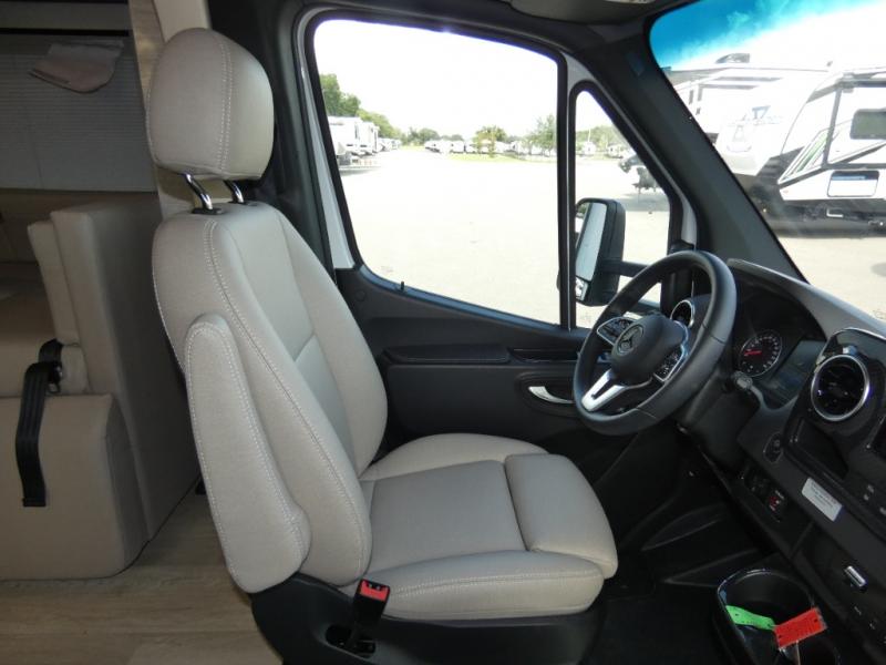 With the Winnebago Navion Class C diesel motorhome, campsite setup is made easier with a powered patio awning with LED lights and Bluetooth control that you can control with a smartphone app, a slide out that is easily moved outward with a push of a button, and your sleeping accommodations are flexible with your activities. The Mercedes-Benz RWD Sprinter chassis, turbo-diesel engine, Adaptive ESP technology, and hydraulic brakes with ABS, are a few reasons you will love driving this coach anywhere, plus all the cab conveniences. The interior offers laminate countertops and vinyl flooring throughout for easy care, cabinets with accent lighting, toe kick lighting to help when your hands are full, and charging stations for your electronics. You will stay powered up with two 100-watt solar panels, a generator, a 2,000-watt pure sine wave inverter, plus more features included with the electrical system.