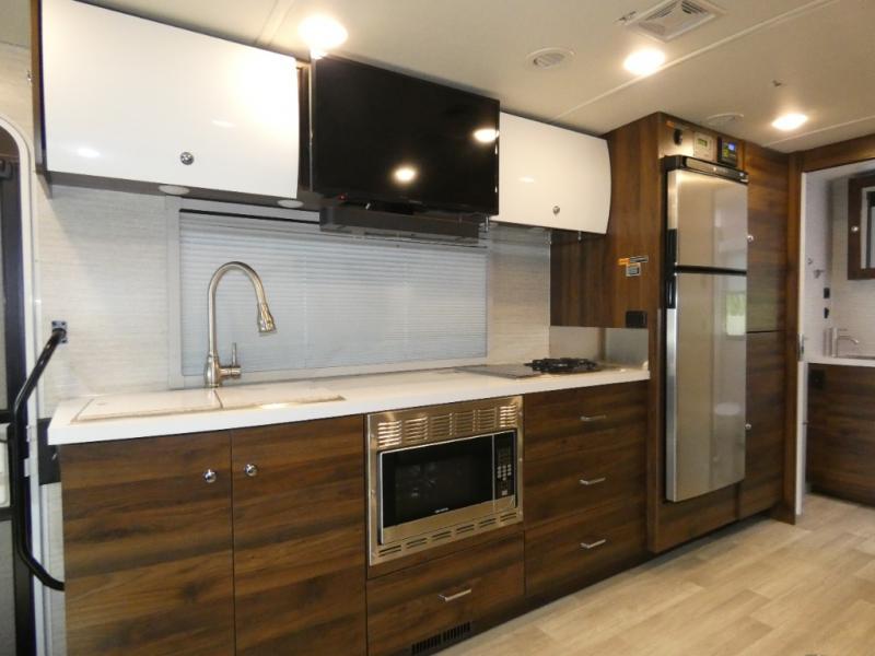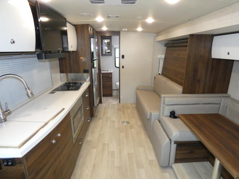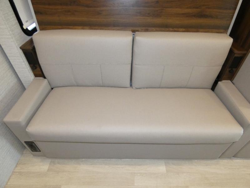 This family-friendly coach offers sleeping space for six when you utilize the Murphy Bed, the cabover bunk and the U-shaped dinette with footrests as sleeping space! During the day, the sofa easily replaces the Murphy bed so you can dine at the pedestal table that you grabbed from the front area's location. The heated power control cab seats include armrests, adjustable lumbar support, headrest, recline, slide and manual swivel functions giving you ultimate comfort on the road and while at your RV spot. The cook will love having a galley kitchen with a microwave/convection oven and 12V compressor-driven refrigerator/freezer to keep everyone fed.