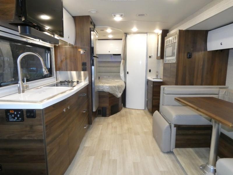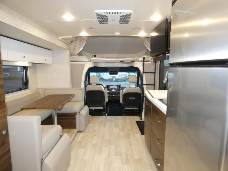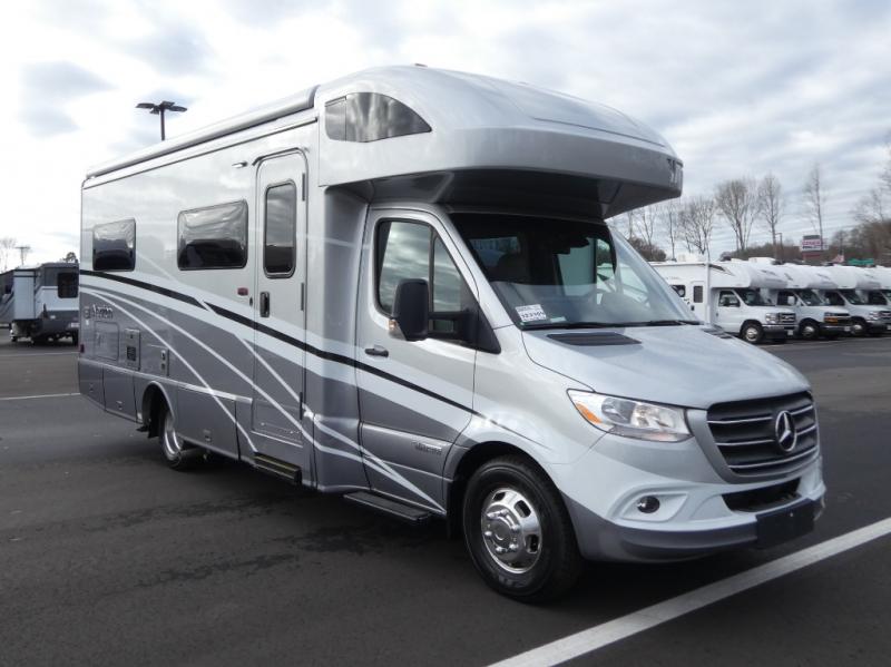 With the Winnebago Navion Class C diesel motorhome, campsite setup is made easier with a powered patio awning with LED lights and Bluetooth control that you can control with a smartphone app, a slide out that is easily moved outward with a push of a button, and your sleeping accommodations are flexible with your activities. The Mercedes-Benz RWD Sprinter chassis, turbo-diesel engine, Adaptive ESP technology, and hydraulic brakes with ABS, are a few reasons you will love driving this coach anywhere, plus all the cab conveniences. The interior offers laminate countertops and vinyl flooring throughout for easy care, cabinets with accent lighting, toe kick lighting to help when your hands are full, and charging stations for your electronics. You will stay powered up with two 100-watt solar panels, a FlexPower generator, a 2,000-watt pure sine wave inverter, plus more features included with the electrical system.
