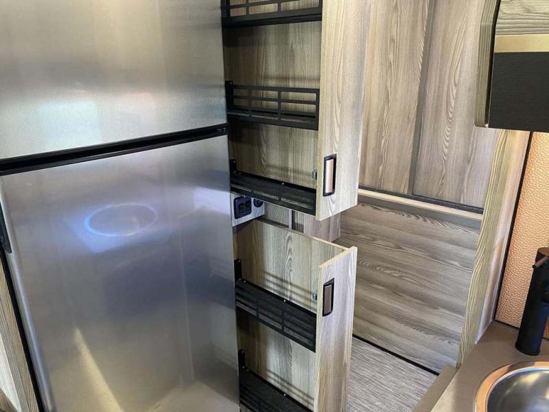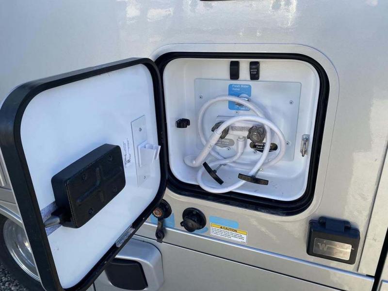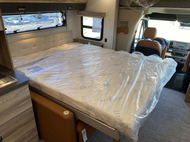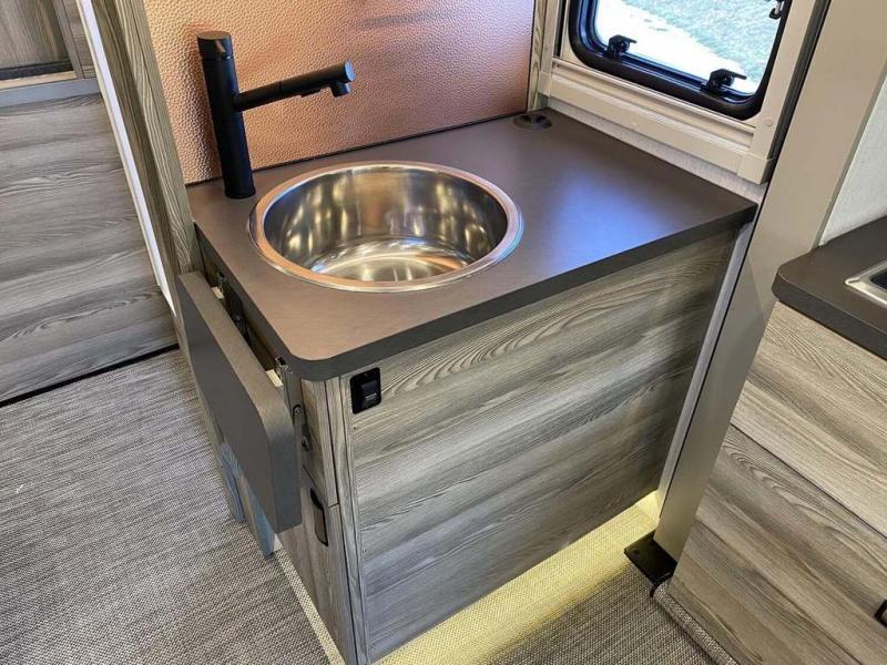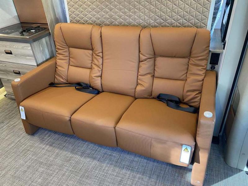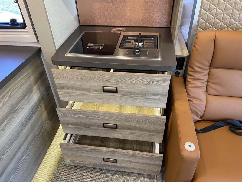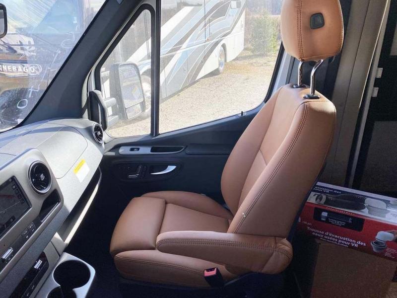 The Winnebago Navion 24T and 24R Class C diesel motorhomes are functional, innovative, and stylish! You can rule the interstate with the Mercedes-Benz RWD Sprinter chassis, or choose the optional Mercedes-Benz AWD Sprinter chassis to tackle tougher terrain. A Lithium Power Package comes with a 320-amp-hour lithium battery and a dedicated second alternator that will allow you to charge the batteries faster while you're on the road. There are also two 120-watt solar panels to keep you going when you're off-grid. Since there is a heated gear garage with L-track cargo tie-downs, you can bring along two full-size bikes and additional gear for hiking, plus there are 110V/12V charging ports and LED lighting here for added convenience. The contemporary interior features blackout roller shades for the lounge and dining area, woven vinyl flooring throughout, and dimmable LED lighting. There is also a Winnebago Connect that is integrated into your Winnebago app that acts as your RV companion. Now you can stay informed on vehicle system alerts, travel prep resources, energy management, and more!