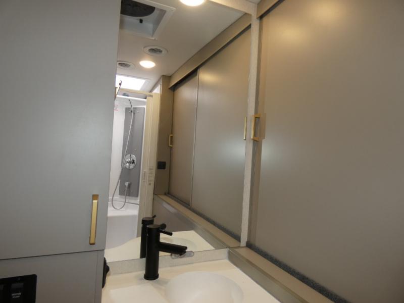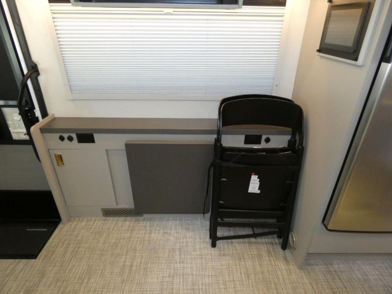 The perfect couples coach or for a family of three or four! This versatile Murphy bed unit will offer you sleeping space when you need it, then a comfortable living area during the day with plenty of seating all while keeping your same coach length. You will be able to easily set up the queen Murphy+ bed when it's time for bedtime while the kids or your guests sleep on the 49" x 75" cabover bunk. Everyone can get cleaned up in the full bathroom that has a space-saving sliding door and large bath wardrobe along the very rear that features a gear garage below. Create yummy meals and snacks using the kitchen appliances and the flip-up counter, then dine at the fold-down table with chairs, or eat seated on the theater seating with lap tables nearby on either side.