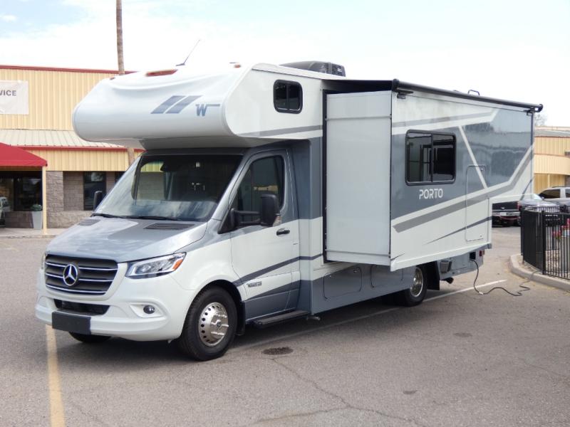 Plan to see new sights with luxurious features in a Porto Class C diesel motorhome by Winnebago. You can go off-grid if you choose with the the 2-100-watt solar panels, generator, plus two deep-cycle Group 31 RV batteries. The MBUX infotainment center with navigation and a rear camera system will make it easy to get to your locations and help ease into your camping space. These motorhomes include vinyl flooring throughout, blackout roller shades for privacy, thermoformed countertops with a decorative backsplash, plus a queen mattress with WinnSleep® technology for your comfort. Outside, you'll appreciate the power awning with LED lights that will create an inviting space, the lighted storage compartment for all your gear, plus so much more!