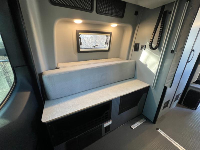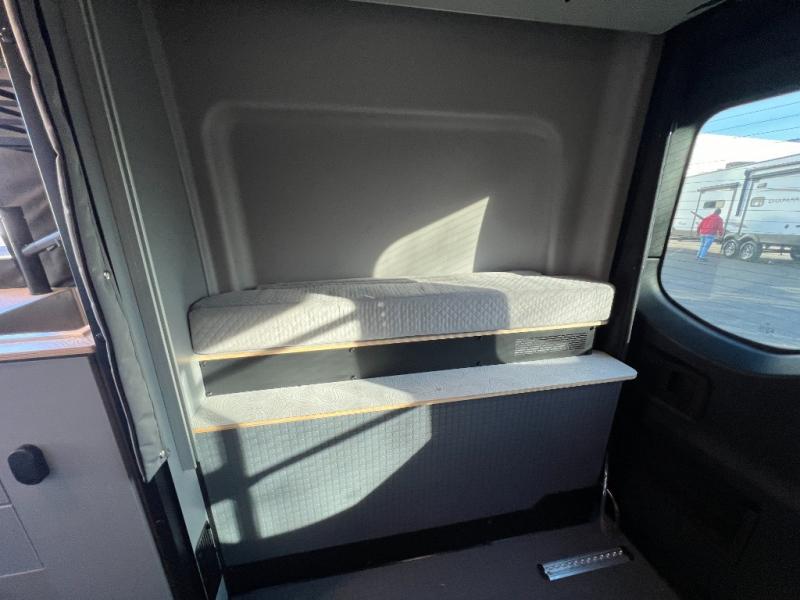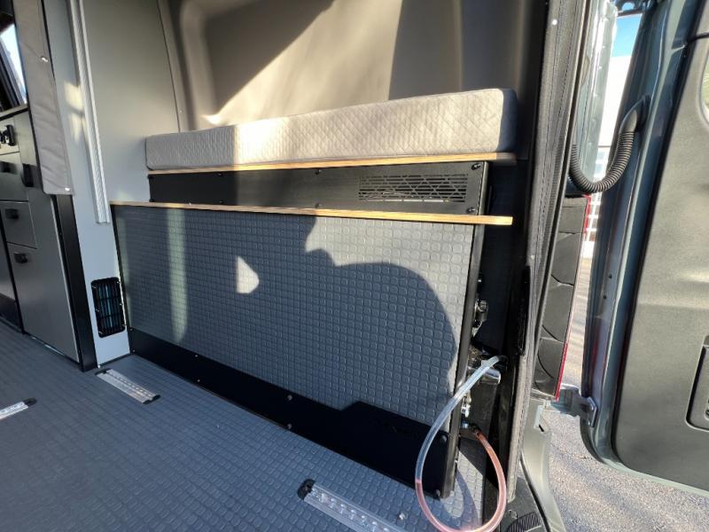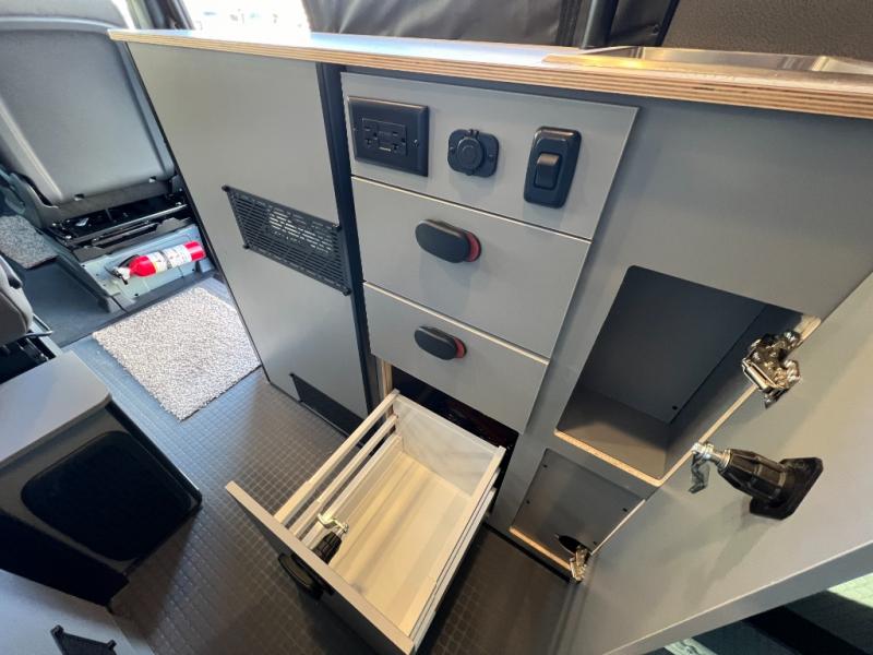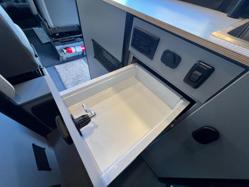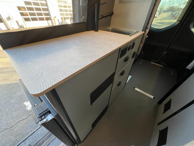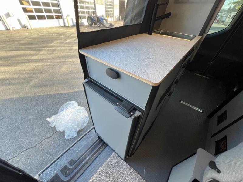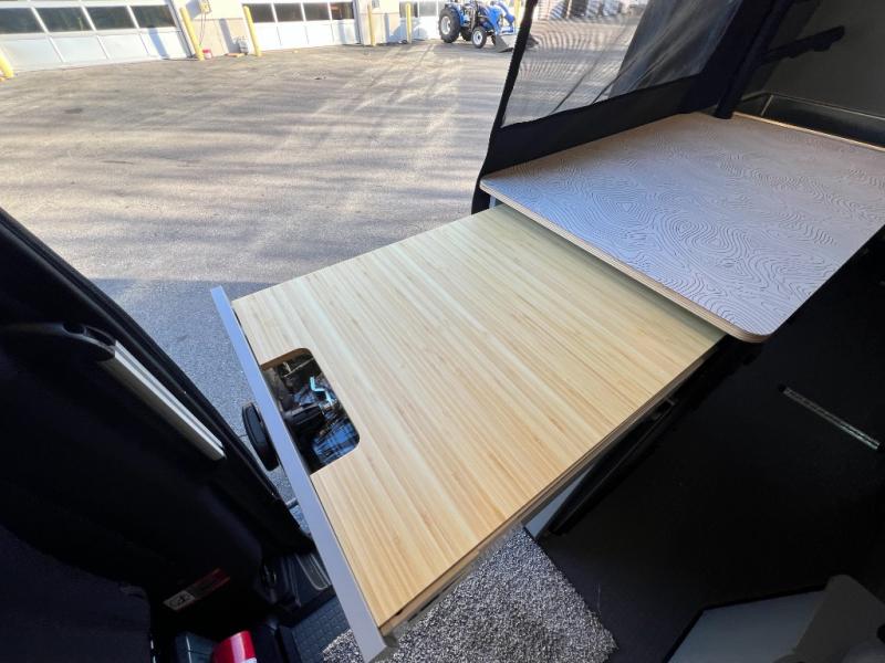 Looking for adventure yet not sure which road you'll take? This camper van offers the outdoor enthusiast a way to venture the unknown. Once at your destination, you can easily set up the interior including a power lift bed in the rear. The cab seats swivel around and there is a bench seat with adjustable table for easy dining opposite. There is even a fold-down outside table to dine outdoors if you want. You will find storage throughout including in the gear garage below the bed where you can store your hiking sticks and backpacks. The cook will have a portable single induction range top, a stainless steel sink, and a counter extension for more prep space plus a refrigerator below the counter. There is also a wet bath to stay clean and refreshed!