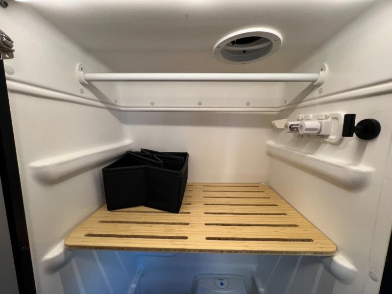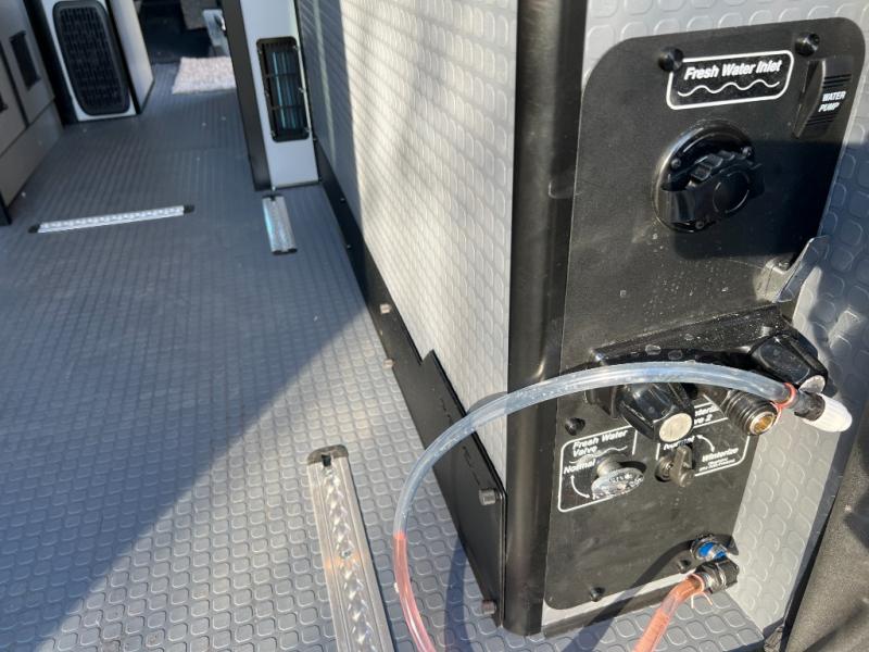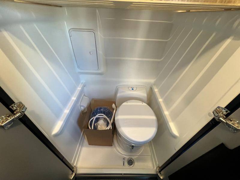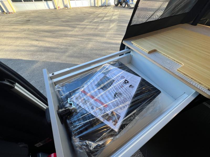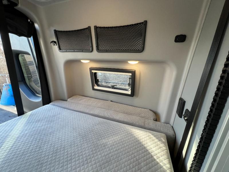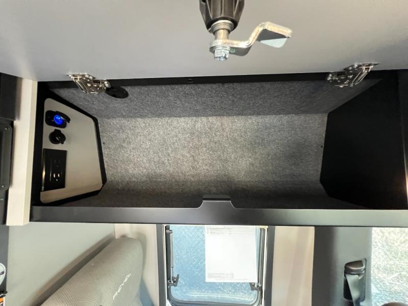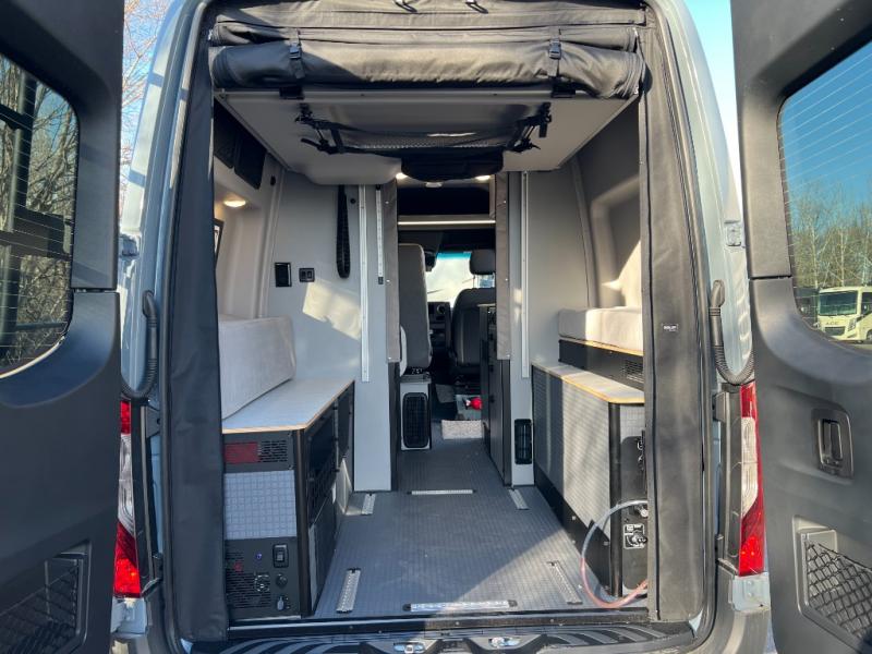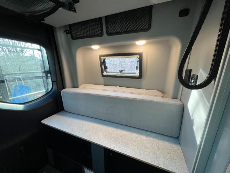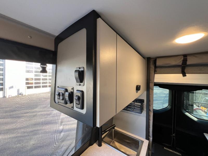 Looking for adventure yet not sure which road you'll take? This camper van offers the outdoor enthusiast a way to venture the unknown. Once at your destination, you can easily set up the interior including a power lift bed in the rear. The cab seats swivel around and there is a bench seat with adjustable table for easy dining opposite. There is even a fold-down outside table to dine outdoors if you want. You will find storage throughout including in the gear garage below the bed where you can store your hiking sticks and backpacks. The cook will have a portable single induction range top, a stainless steel sink, and a counter extension for more prep space plus a refrigerator below the counter. There is also a wet bath to stay clean and refreshed!