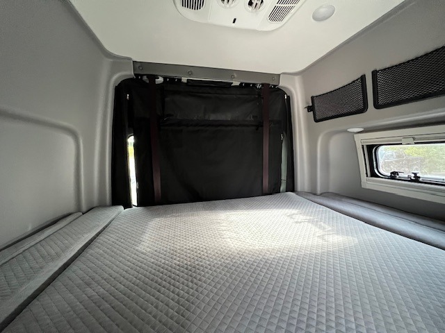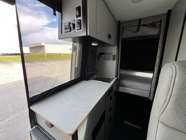 Looking for adventure yet not sure which road you'll take? This camper van offers the outdoor enthusiast a way to venture the unknown. Once at your destination, you can easily set up the interior including a power lift bed in the rear. The cab seats swivel around and there is a bench seat with adjustable table for easy dining opposite. There is even a fold-down outside table to dine outdoors if you want. You will find storage throughout including in the gear garage below the bed where you can store your hiking sticks and backpacks. The cook will have a portable single induction range top, a stainless steel sink, and a counter extension for more prep space plus a refrigerator below the counter. There is also a wet bath to stay clean and refreshed!