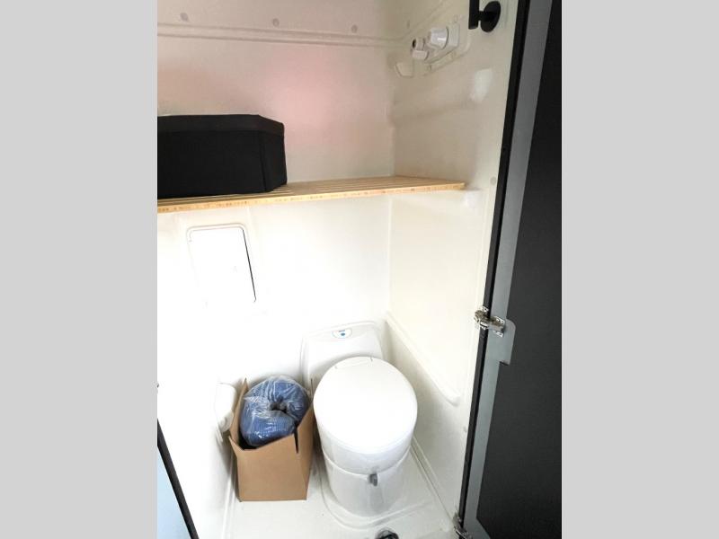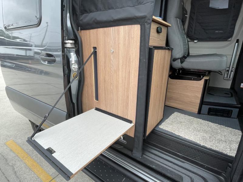 Looking for adventure yet not sure which road you'll take? This camper van offers the outdoor enthusiast a way to venture the unknown. Once at your destination, you can easily set up the interior including a power lift bed in the rear. The cab seats swivel around and there is a bench seat with adjustable table for easy dining opposite. There is even a fold-down outside table to dine outdoors if you want. You will find storage throughout including in the gear garage below the bed where you can store your hiking sticks and backpacks. The cook will have a portable single induction range top, a stainless steel sink, and a counter extension for more prep space plus a refrigerator below the counter. There is also a wet bath to stay clean and refreshed!