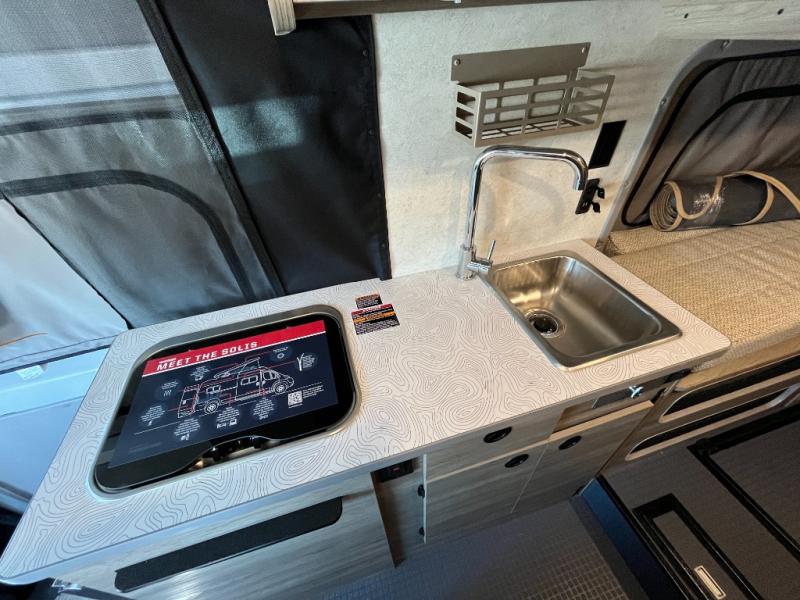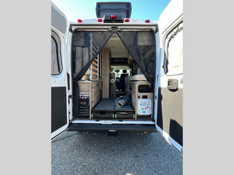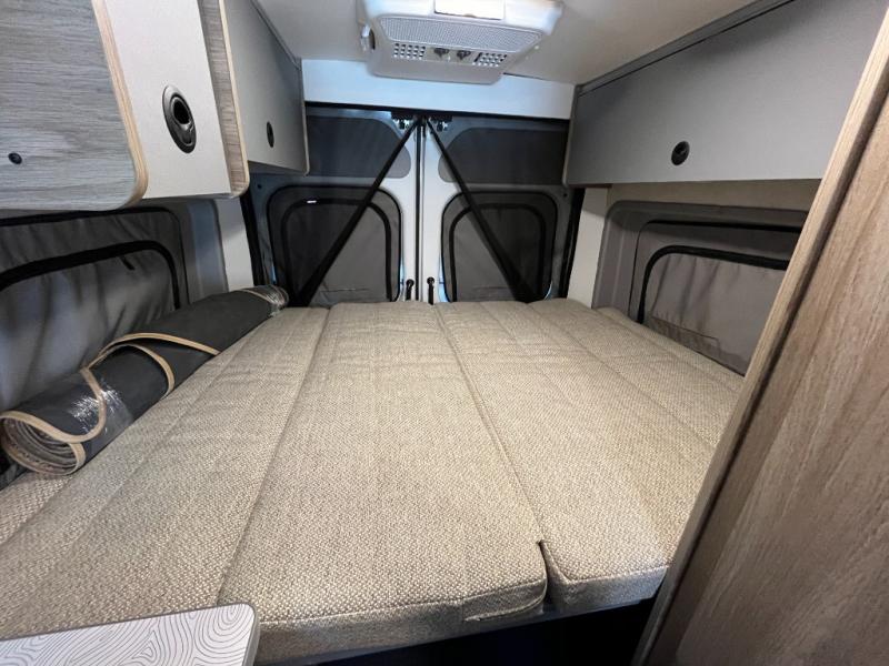 Enjoy a weekend ride in the mountains or make it an overnight stay with versatile sleeping options in this camper van. You'll find the Murphy+ bed in the back will provide a great night's rest, or you can choose the optional sofa/bed with added belted seating if you have more tag-alongs. And of course the little ones will love the pop-top sleeping area to climb into each night. After you've freshened up in the convenient wet bath, prepare breakfast on the two burner range, and the milk and eggs can go back in the 3.0 cu. ft. single door refrigerator/freezer. This model also includes rear double doors with screens to let the breeze in and keep bugs out!