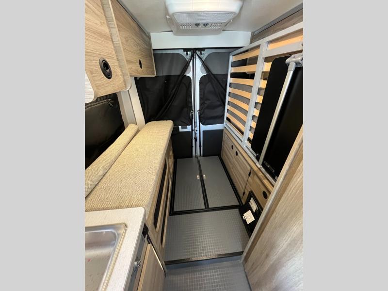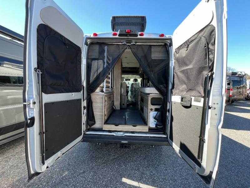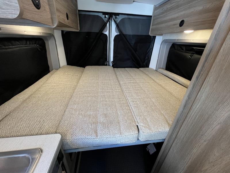 Enjoy a weekend ride in the mountains or make it an overnight stay with versatile sleeping options in this camper van. You'll find the Murphy+ bed in the back will provide a great night's rest, or you can choose the optional sofa/bed with added belted seating if you have more tag-alongs. And of course the little ones will love the pop-top sleeping area to climb into each night. After you've freshened up in the convenient wet bath, prepare breakfast on the two burner range, and the milk and eggs can go back in the 3.0 cu. ft. single door refrigerator/freezer. This model also includes rear double doors with screens to let the breeze in and keep bugs out!