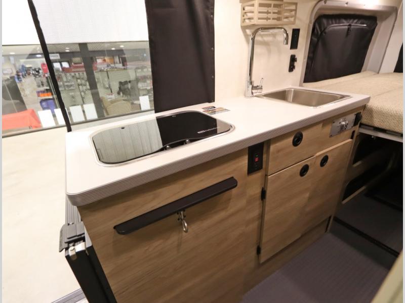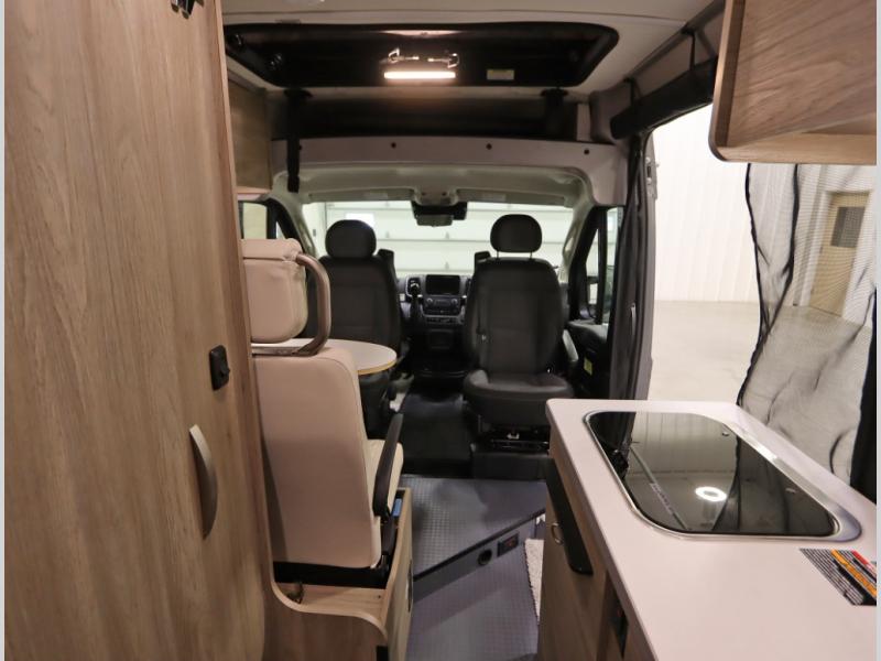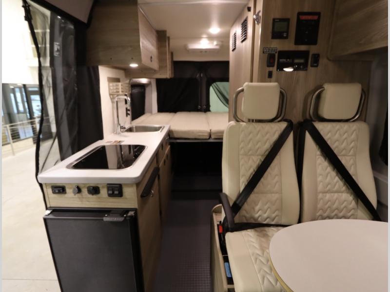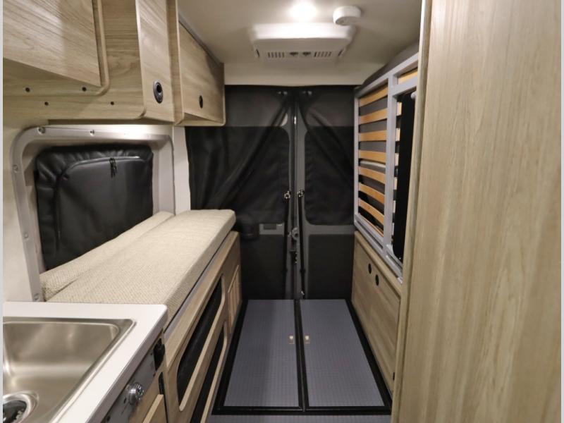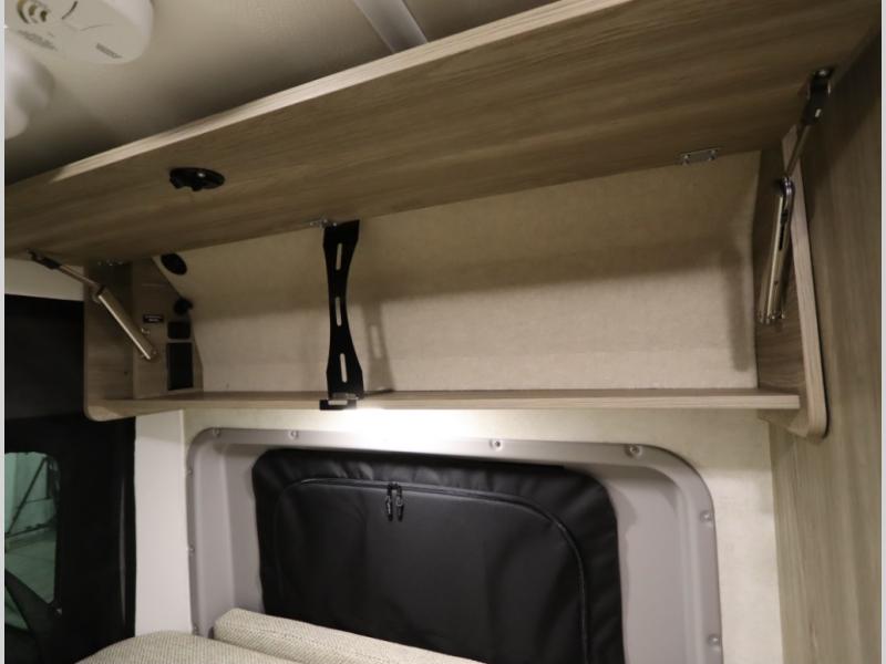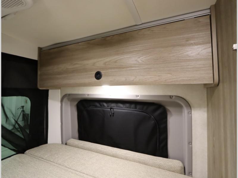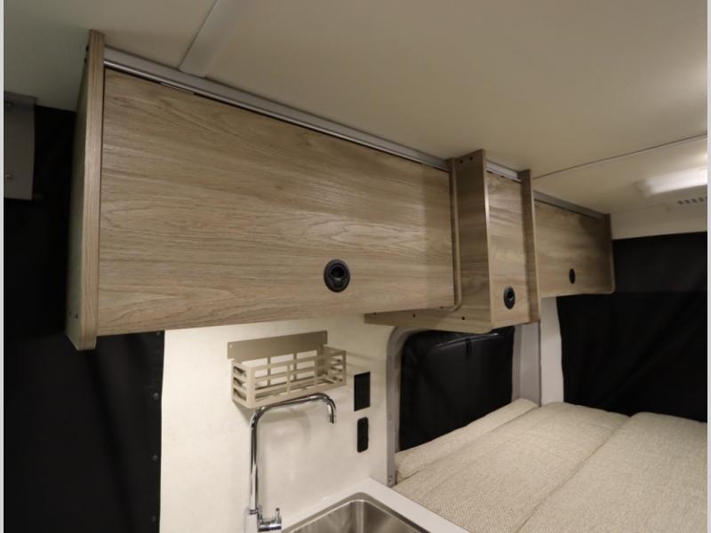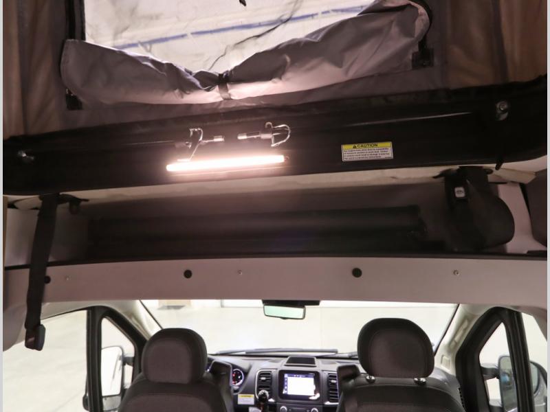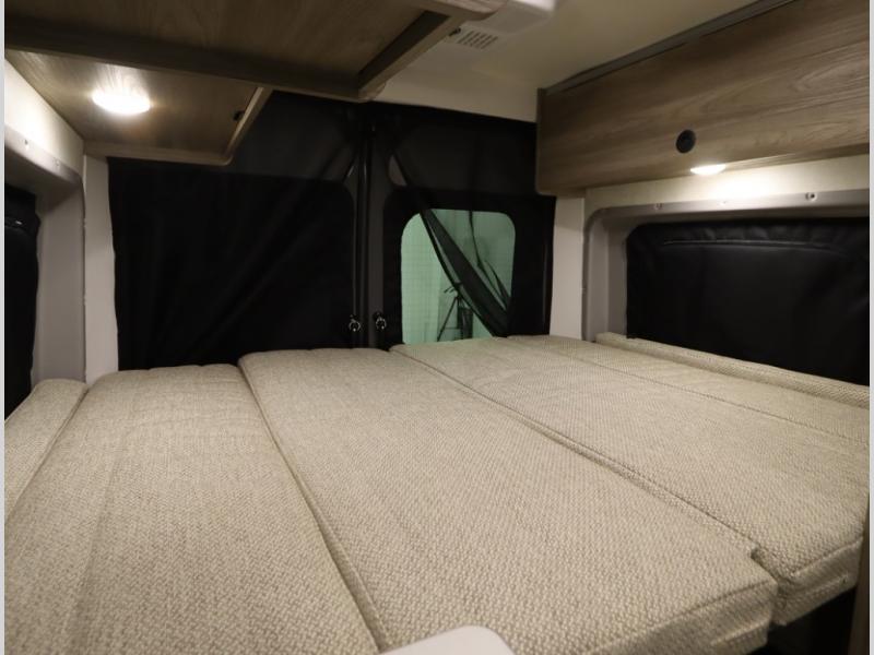 The popular Solis is available with or without the overhead pop top studio loft sleeping surface that includes the Froli deluxe sleep system! Plus you can increase sleeping now with the Luno front cab air mattress for a 30 x 65 in additional sleeping surface. Towards the rear of the van, the standard cross coach sleeping Murphy Bed is available or can be replaced with a sofa bed as well!