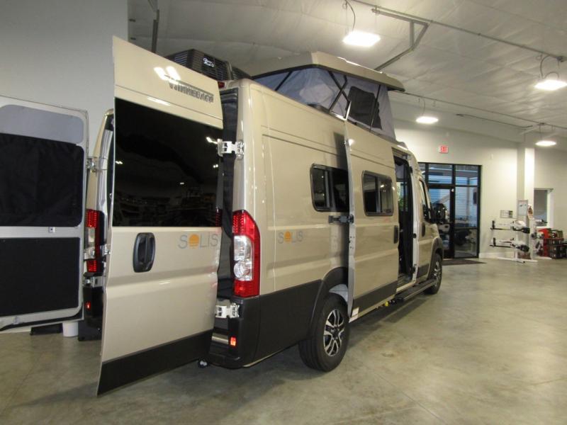 Each Solis Class B gas motorhome by Winnebago sits upon a fuel-efficient Ram ProMaster chassis with a 3.6L V6 engine to power your adventures. You will love the cab conveniences that make each trip enjoyable, like the radio/review monitor system touchscreen and the crosswind assist to keep you steady on the road. Some of the hassle-free amenities you will appreciate are the exterior wash station, the Eco-Hot water system, and the water center control panel located inside the right rear door. Head indoors to find heavy-duty vinyl flooring throughout, a laminate countertop and a stainless steel sink in the galley, plus tinted coach windows for added privacy. The Solis also features off-grid capabilities with its two deep-cycle Group 31 batteries and 220-watt flexible surface solar panel with a controller. Adventures awaits in the Solis Class B gas motorhome!
