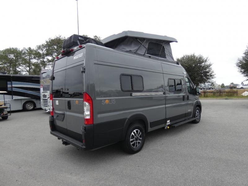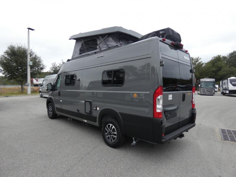 Each Solis Class B gas motorhome by Winnebago sits upon a fuel-efficient Ram ProMaster chassis with a 3.6L V6 engine to power your adventures. You will love the cab conveniences that make each trip enjoyable, like the radio/review monitor system touchscreen and the crosswind assist to keep you steady on the road. Some of the hassle-free amenities you will appreciate are the exterior wash station, the Eco-Hot water system, and the water center control panel located inside the right rear door. Head indoors to find heavy-duty vinyl flooring throughout, a laminate countertop and a stainless steel sink in the galley, plus tinted coach windows for added privacy. The Solis also features off-grid capabilities with its two deep-cycle Group 31 batteries and 220-watt flexible surface solar panel with a controller. Adventures awaits in the Solis Class B gas motorhome!