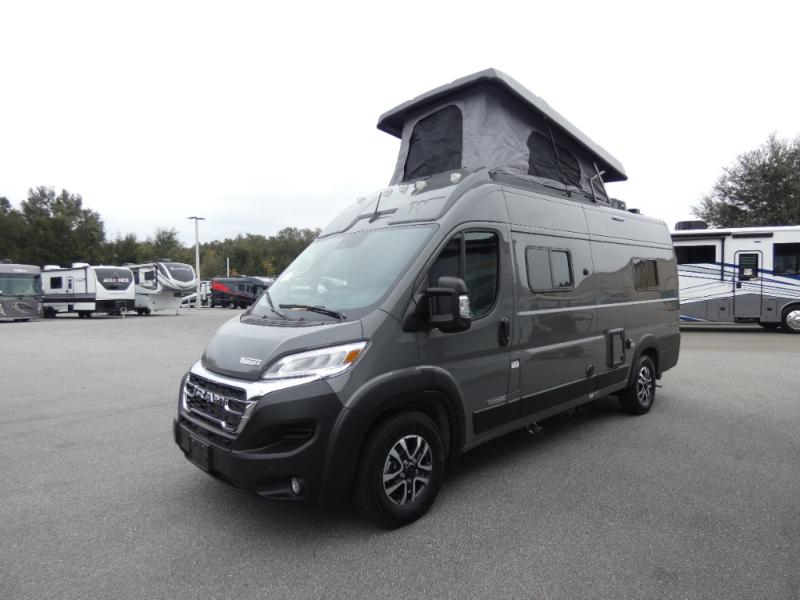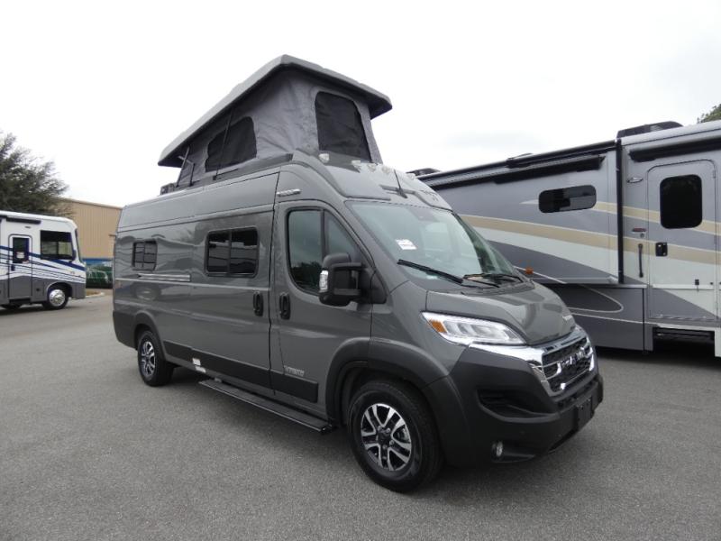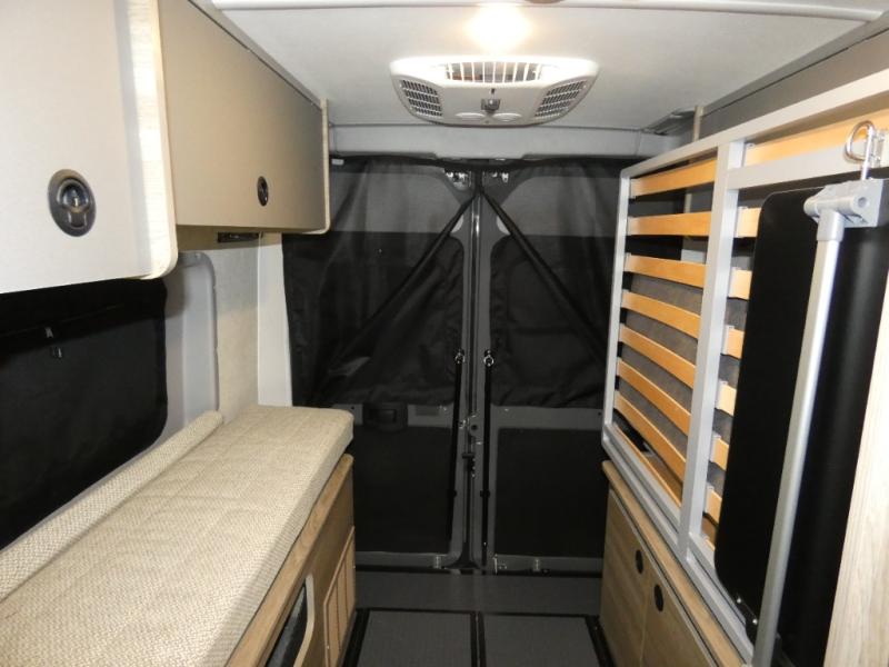 This camper van with an L-track storage system is perfect for those needing more storage space for their hiking and biking gear. You can stay powered up with the Cummins Onan QG 2800i gas generator, and there is a Coleman Mach 10NDQ A/C with directional vents that will allow you to come inside to cool off after a trail ride. A Murphy+ bed comes standard, and any guests that tag along can sleep in the pop-top sleeping area! If you choose to remove the pop-top, you'll enjoy the deluxe powered ventilator fan instead. You'll find the wet bath to come in handy when you want to clean up, and the dinette seating with a removable pedestal table will provide a place to enjoy your dinner at.