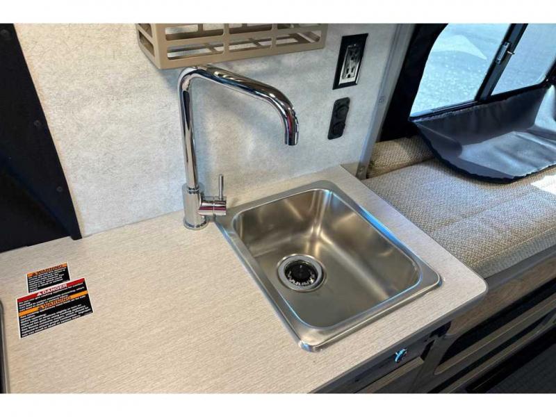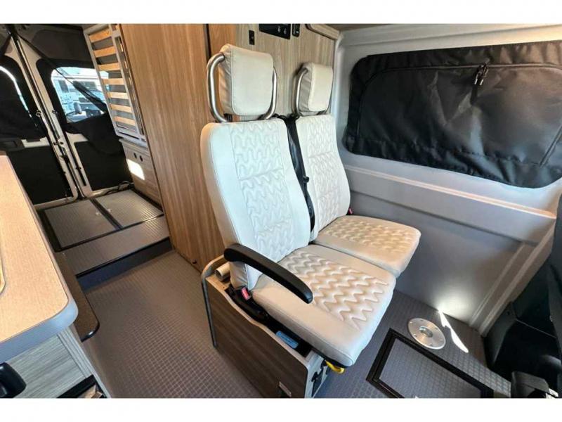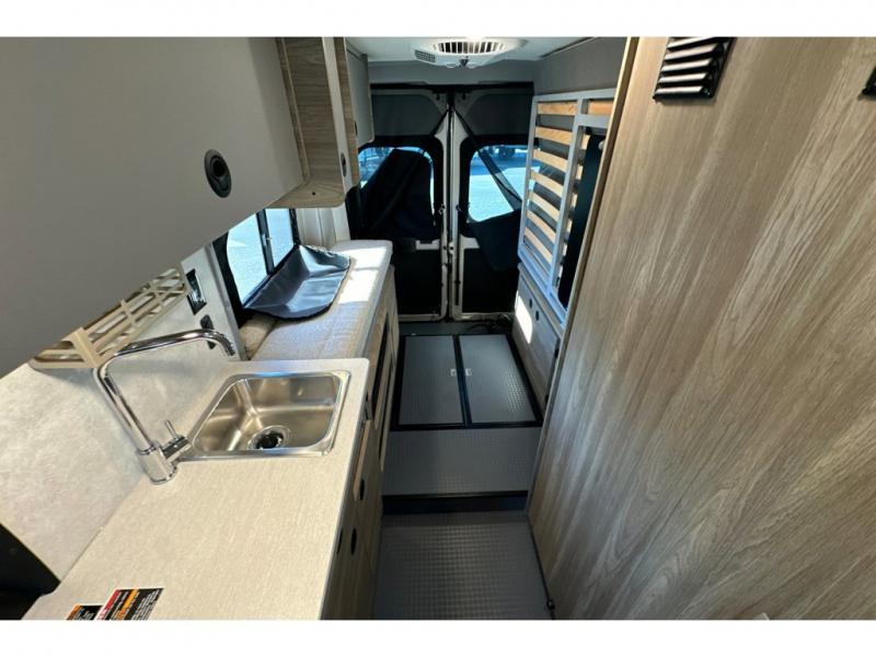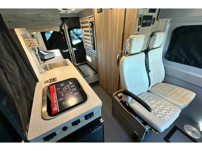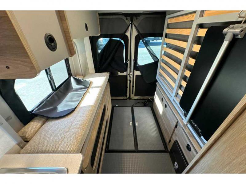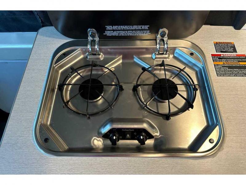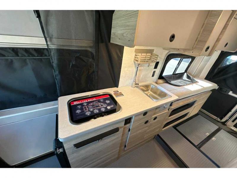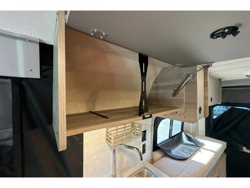 This camper van with an L-track storage system is perfect for those needing more storage space for their hiking and biking gear. You can stay powered up with the Cummins Onan QG 2800i gas generator, and there is a Coleman Mach 10NDQ A/C with directional vents that will allow you to come inside to cool off after a trail ride. A Murphy+ bed comes standard, and any guests that tag along can sleep in the pop-top sleeping area! If you choose to remove the pop-top, you'll enjoy the deluxe powered ventilator fan instead. You'll find the wet bath to come in handy when you want to clean up, and the dinette seating with a removable pedestal table will provide a place to enjoy your dinner at.
