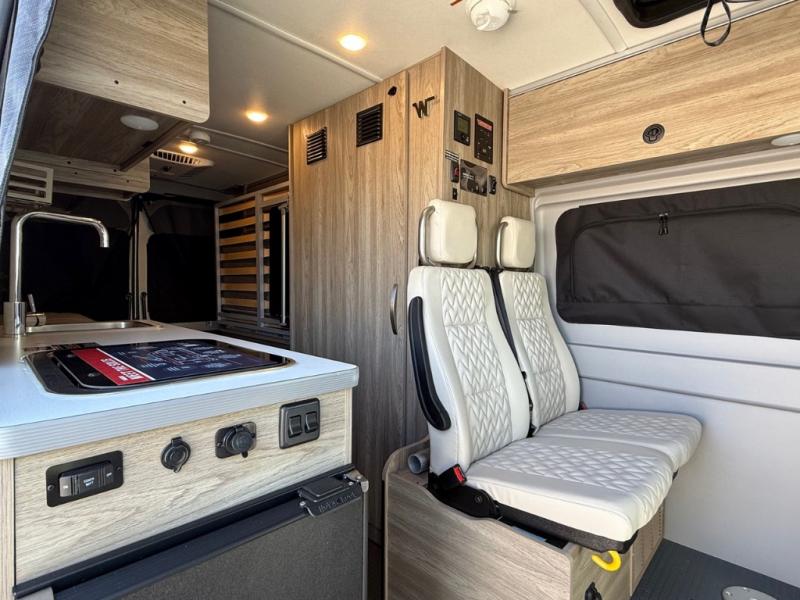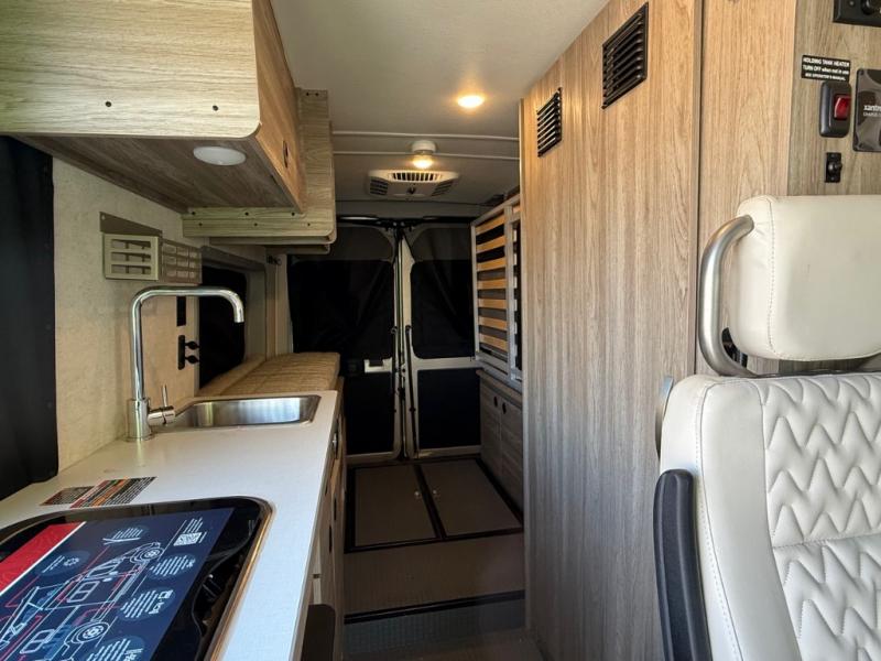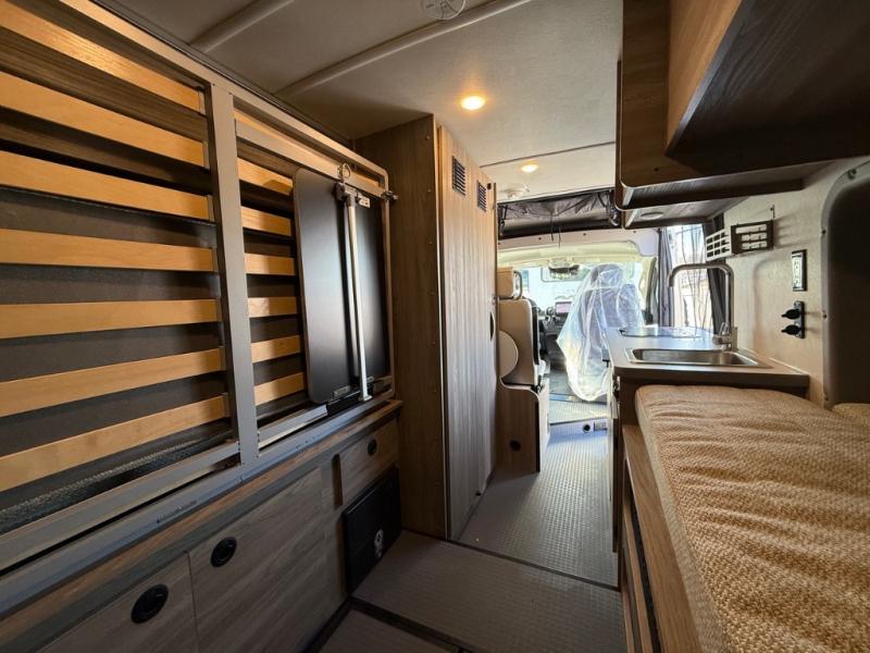 This camper van with an L-track storage system is perfect for those needing more storage space for their hiking and biking gear. You can stay powered up with the Cummins Onan QG 2800i gas generator, and there is a Coleman Mach 10NDQ A/C with directional vents that will allow you to come inside to cool off after a trail ride. A Murphy+ bed comes standard, and any guests that tag along can sleep in the pop-top sleeping area! If you choose to remove the pop-top, you'll enjoy the deluxe powered ventilator fan instead. You'll find the wet bath to come in handy when you want to clean up, and the dinette seating with a removable pedestal table will provide a place to enjoy your dinner at.