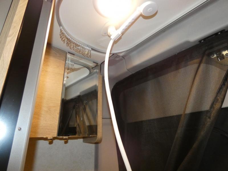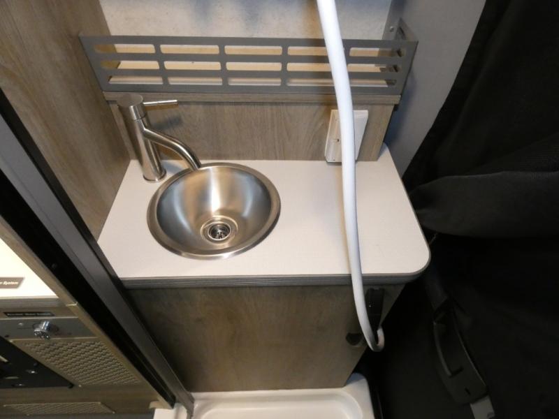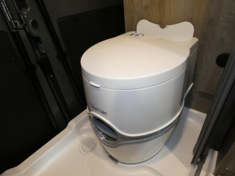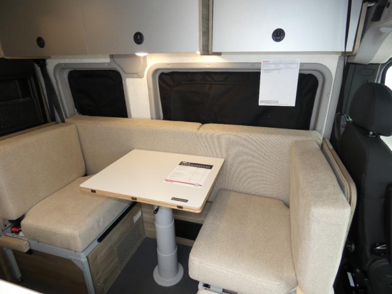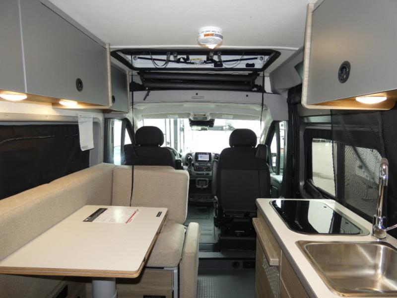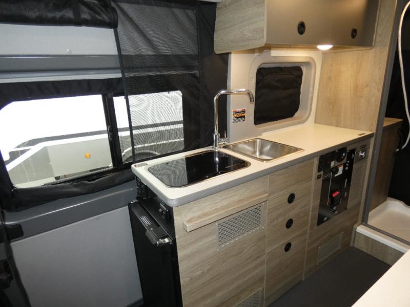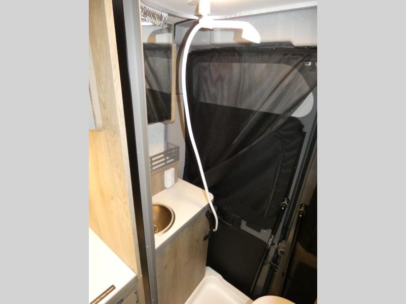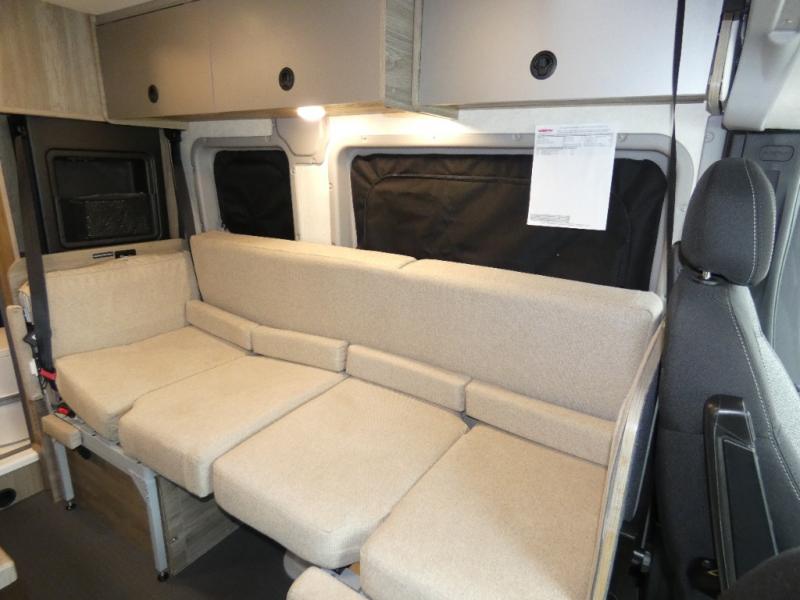 This camper van is perfect for independent travel or if you've got a camping partner to take along with you! The convertible dinette bed can transform into a twin-size bed for one or a double-size bed for two. And the pop-top sleeping area can be used if you're needing more sleeping space The three seating modes include a belt mode, sofa mode, or lounge mode for even more comfort. You will find all you need in the kitchen to prepare meals each day, including a two burner range with a glass cover for more counter space and a 3.0 cu. ft. 12V single door compressor-driven refrigerator/freezer for food storage. There is a shower with a wall surround in the rear wet bath, along with a removable cassette toilet, a medicine cabinet with a mirror, and a wardrobe cabinet with added storage. This space could also be used as a mudroom after a day of exploring, or utilize it for storage!