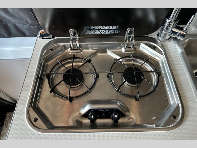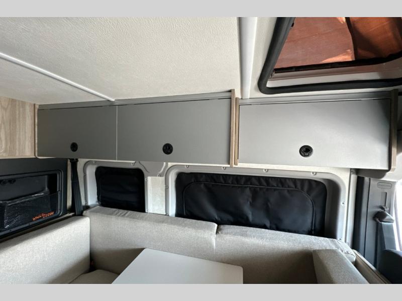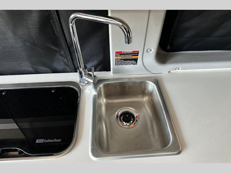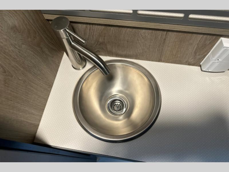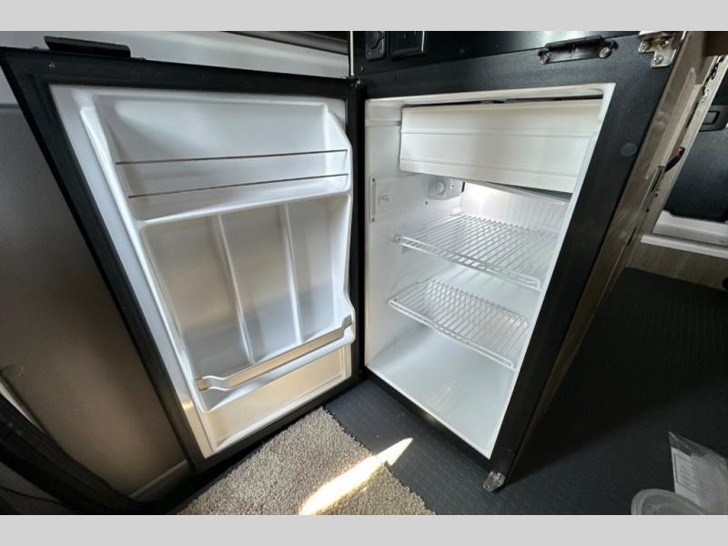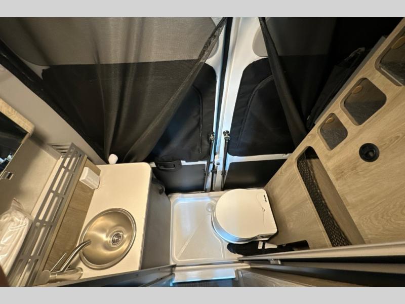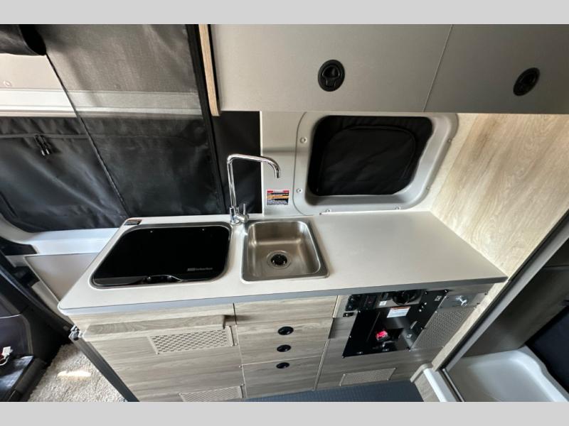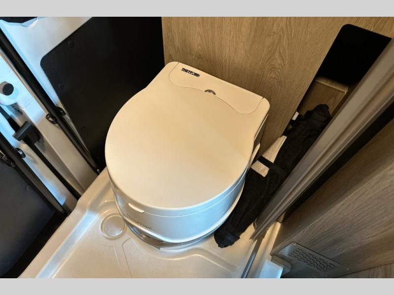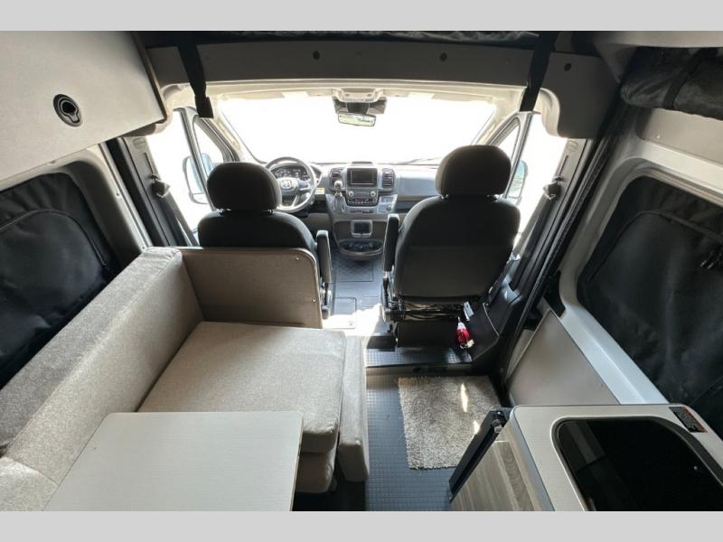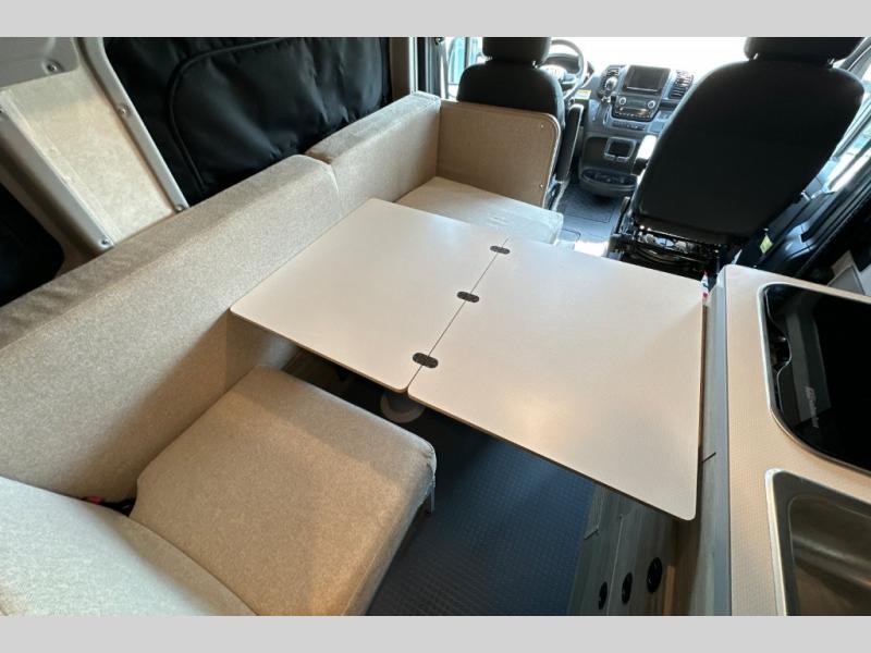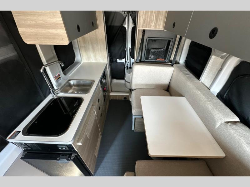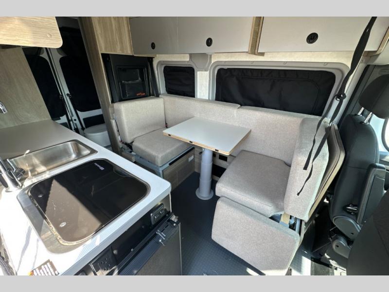 This camper van is perfect for independent travel or if you've got a camping partner to take along with you! The convertible dinette bed can transform into a twin-size bed for one or a double-size bed for two. And the optional pop-top sleeping area can be added if you're needing more sleeping space The three seating modes include a belt mode, sofa mode, or lounge mode for even more comfort. You will find all you need in the kitchen to prepare meals each day, including a two burner range with a glass cover for more counter space and a 3.0 cu. ft. 12V single door compressor-driven refrigerator/freezer for food storage. There is a shower with a wall surround in the rear wet bath, along with a removable cassette toilet, a medicine cabinet with a mirror, and a wardrobe cabinet with added storage. This space could also be used as a mudroom after a day of exploring, or utilize it for storage!