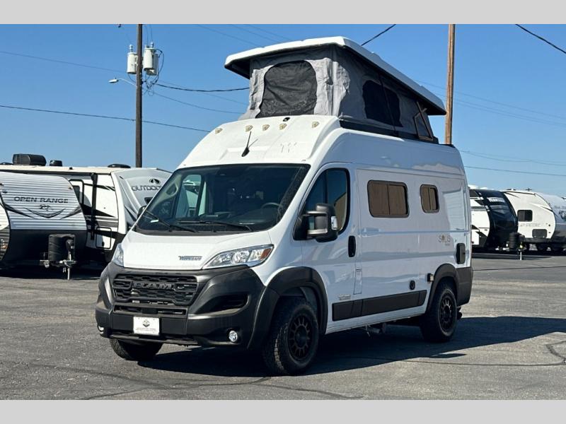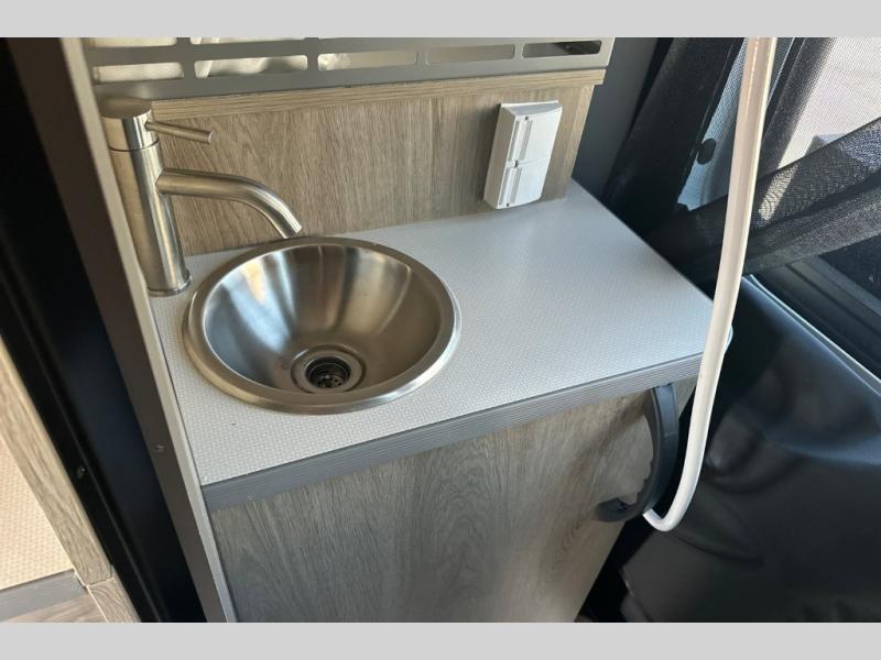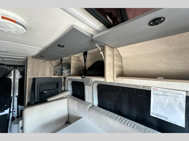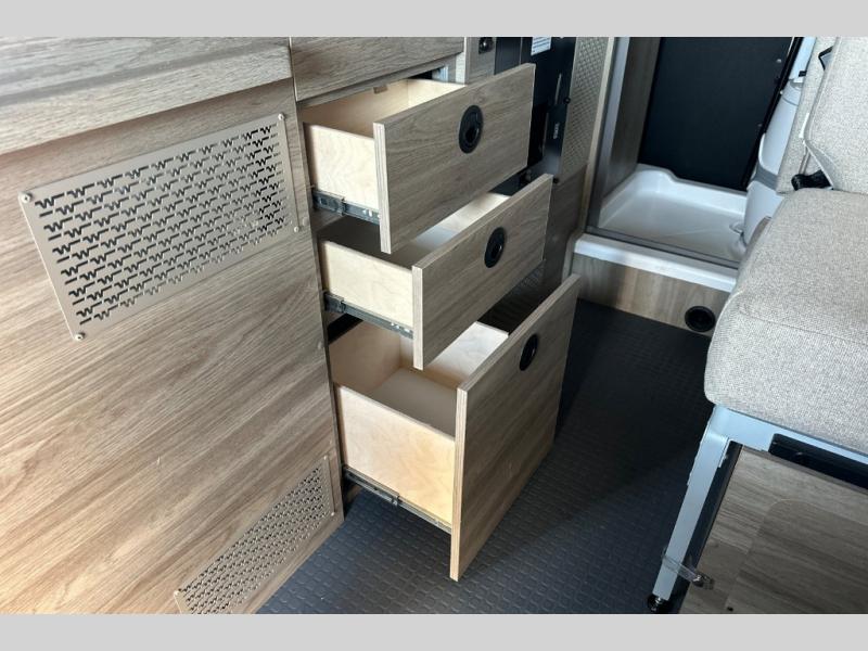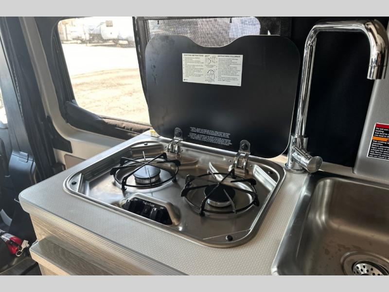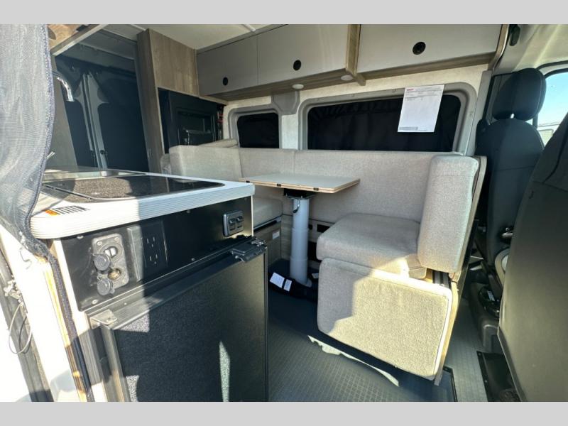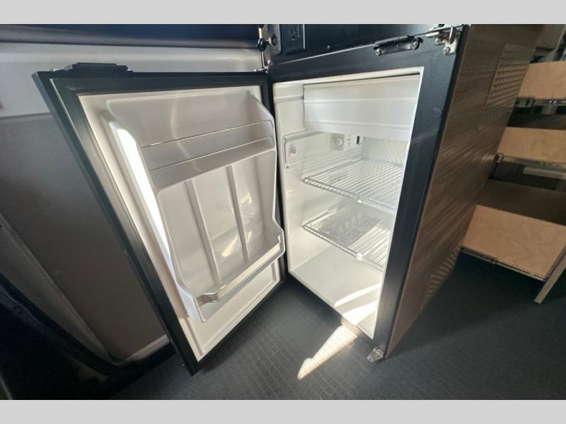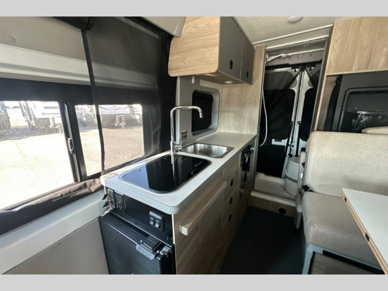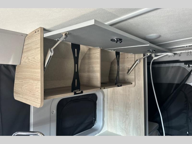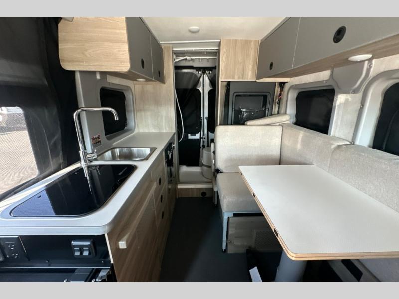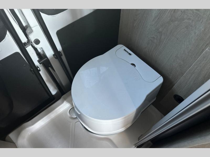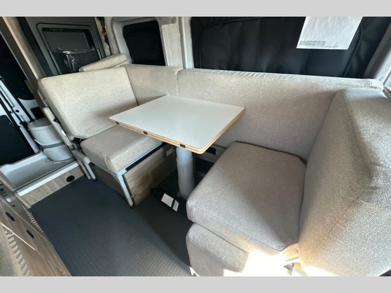 This camper van is perfect for independent travel or if you've got a camping partner to take along with you! The convertible dinette bed can transform into a twin-size bed for one or a double-size bed for two. And the optional pop-top sleeping area can be added if you're needing more sleeping space The three seating modes include a belt mode, sofa mode, or lounge mode for even more comfort. You will find all you need in the kitchen to prepare meals each day, including a two burner range with a glass cover for more counter space and a 3.0 cu. ft. 12V single door compressor-driven refrigerator/freezer for food storage. There is a shower with a wall surround in the rear wet bath, along with a removable cassette toilet, a medicine cabinet with a mirror, and a wardrobe cabinet with added storage. This space could also be used as a mudroom after a day of exploring, or utilize it for storage!