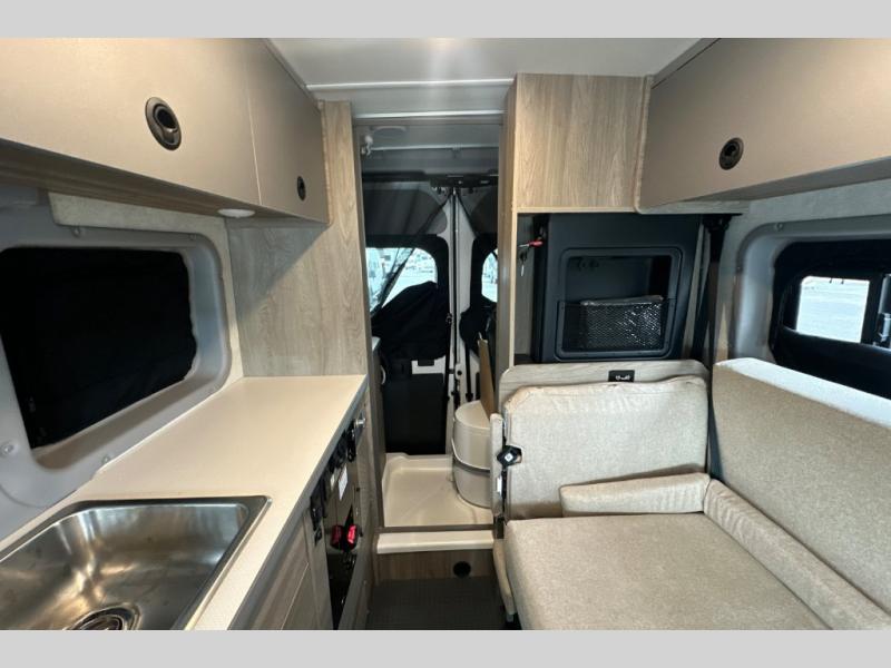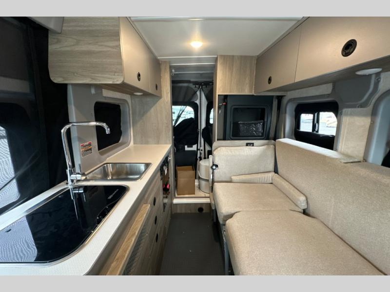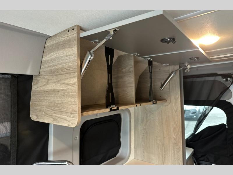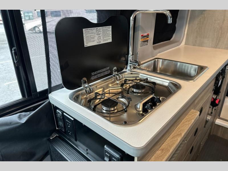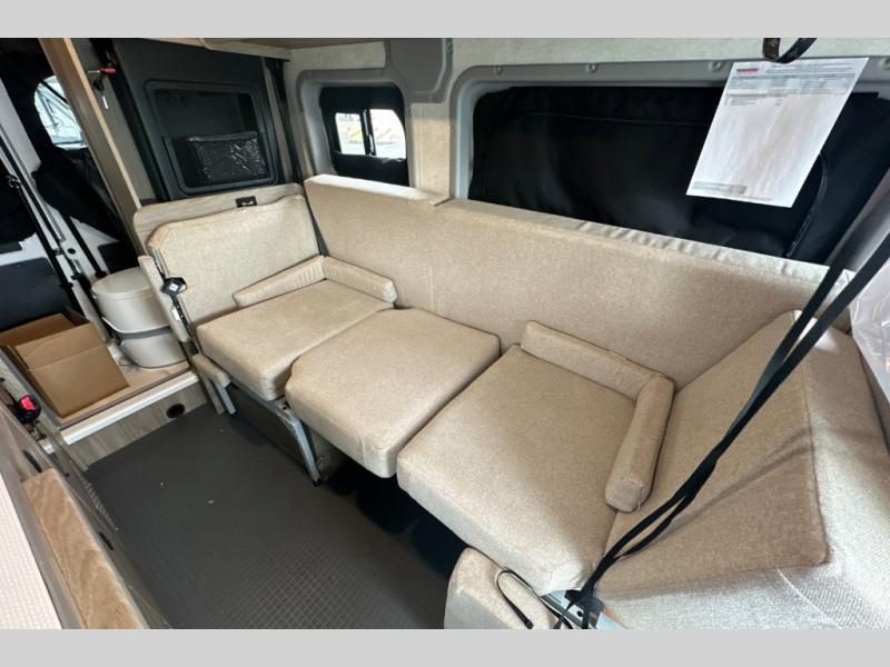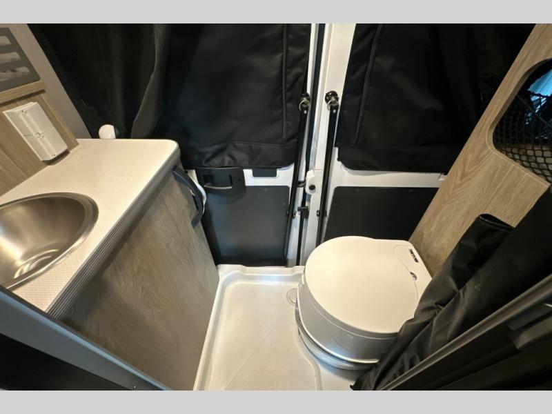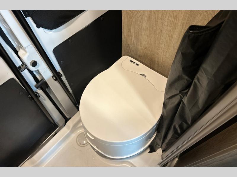 This camper van is perfect for independent travel or if you've got a camping partner to take along with you! The convertible dinette bed can transform into a twin-size bed for one or a double-size bed for two. And the optional pop-top sleeping area can be added if you're needing more sleeping space The three seating modes include a belt mode, sofa mode, or lounge mode for even more comfort. You will find all you need in the kitchen to prepare meals each day, including a two burner range with a glass cover for more counter space and a 3.0 cu. ft. 12V single door compressor-driven refrigerator/freezer for food storage. There is a shower with a wall surround in the rear wet bath, along with a removable cassette toilet, a medicine cabinet with a mirror, and a wardrobe cabinet with added storage. This space could also be used as a mudroom after a day of exploring, or utilize it for storage!