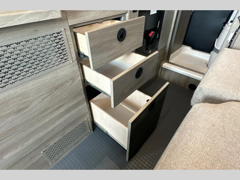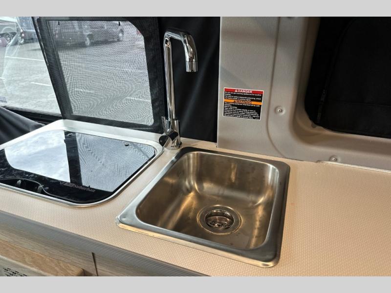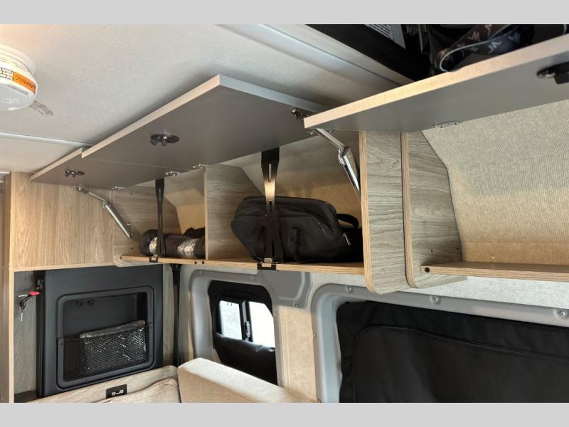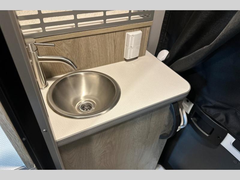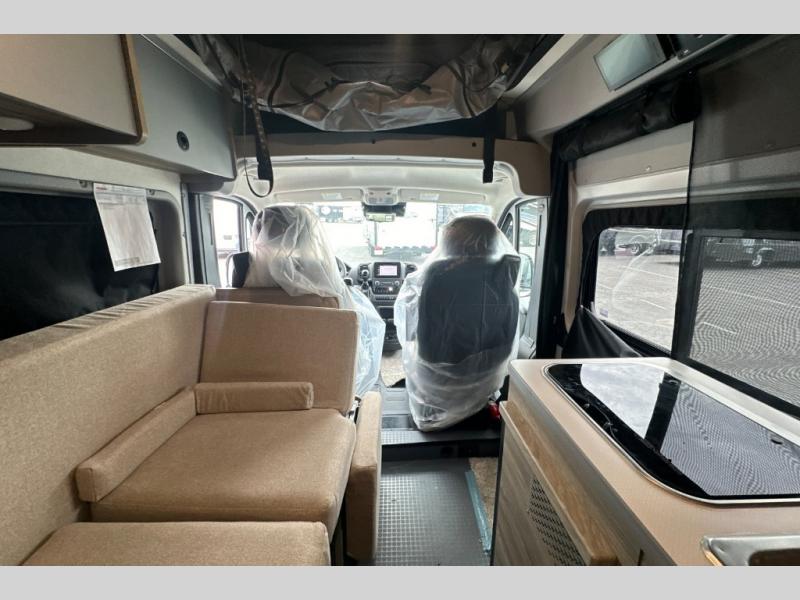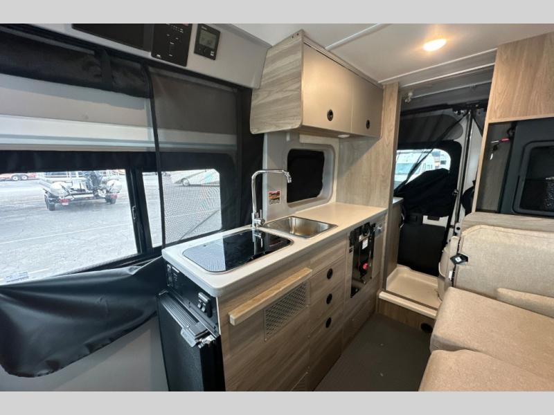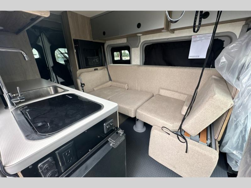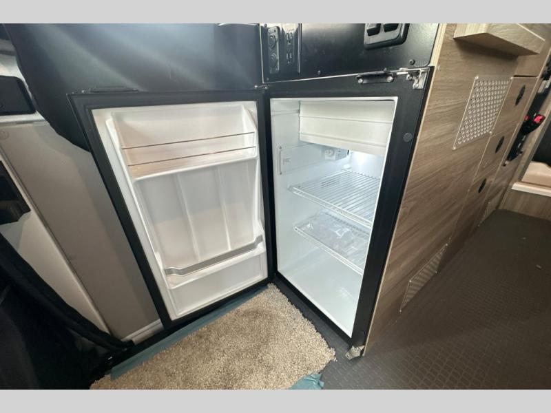 This camper van is perfect for independent travel or if you've got a camping partner to take along with you! The convertible dinette bed can transform into a twin-size bed for one or a double-size bed for two. And the optional pop-top sleeping area can be added if you're needing more sleeping space The three seating modes include a belt mode, sofa mode, or lounge mode for even more comfort. You will find all you need in the kitchen to prepare meals each day, including a two burner range with a glass cover for more counter space and a 3.0 cu. ft. 12V single door compressor-driven refrigerator/freezer for food storage. There is a shower with a wall surround in the rear wet bath, along with a removable cassette toilet, a medicine cabinet with a mirror, and a wardrobe cabinet with added storage. This space could also be used as a mudroom after a day of exploring, or utilize it for storage!