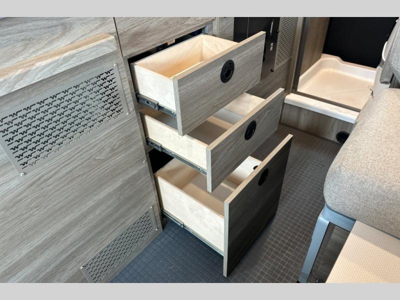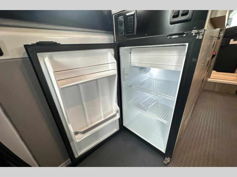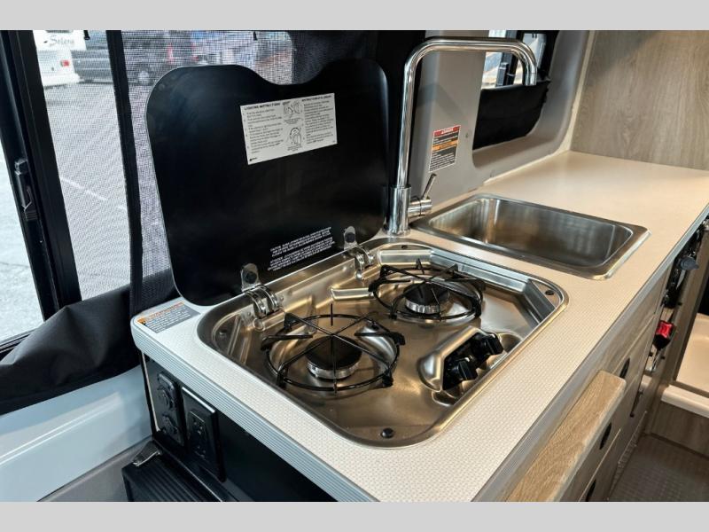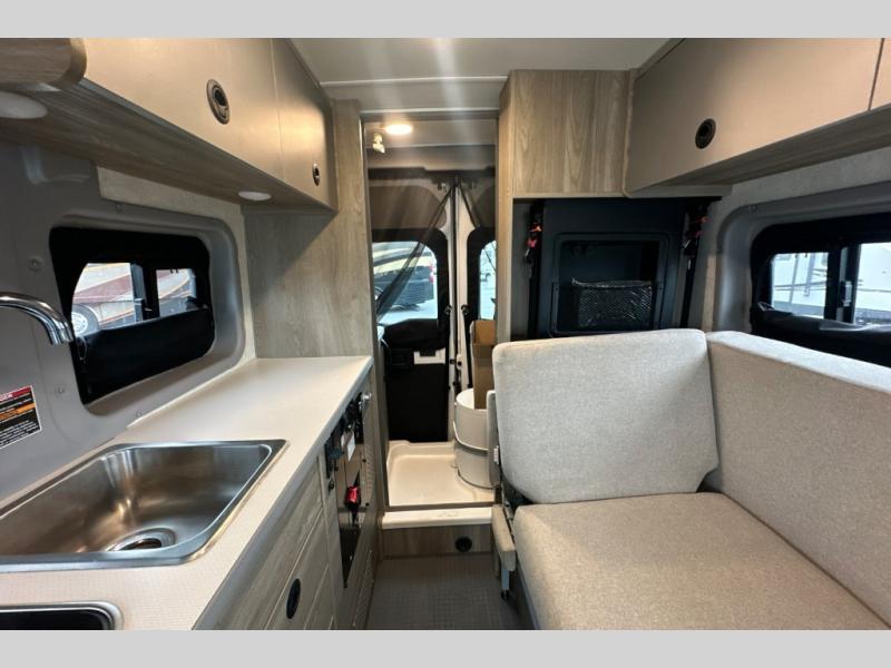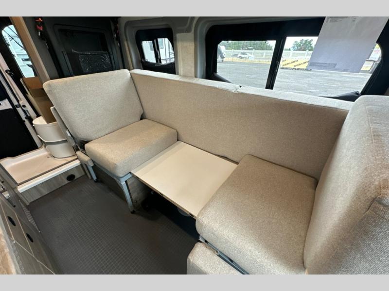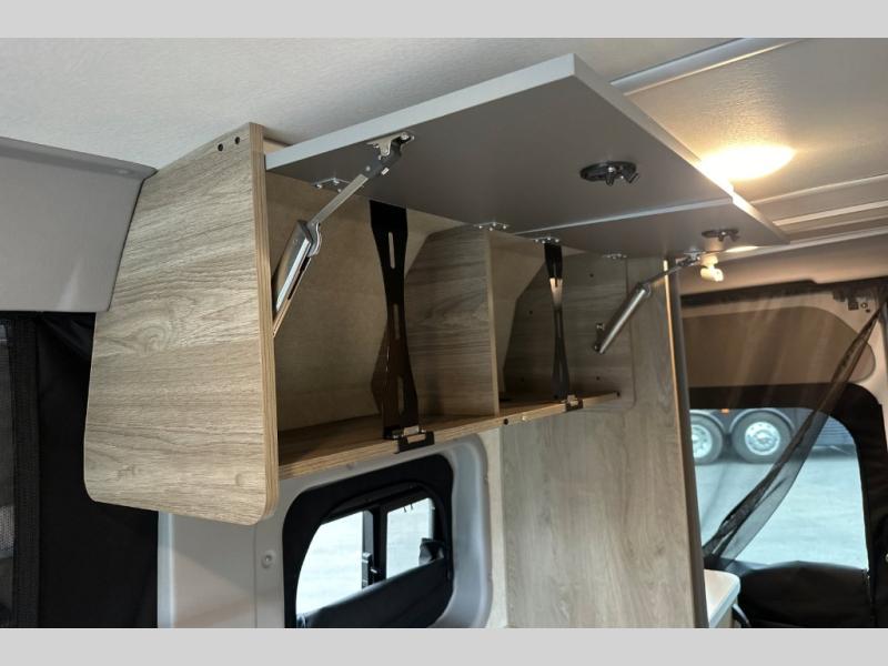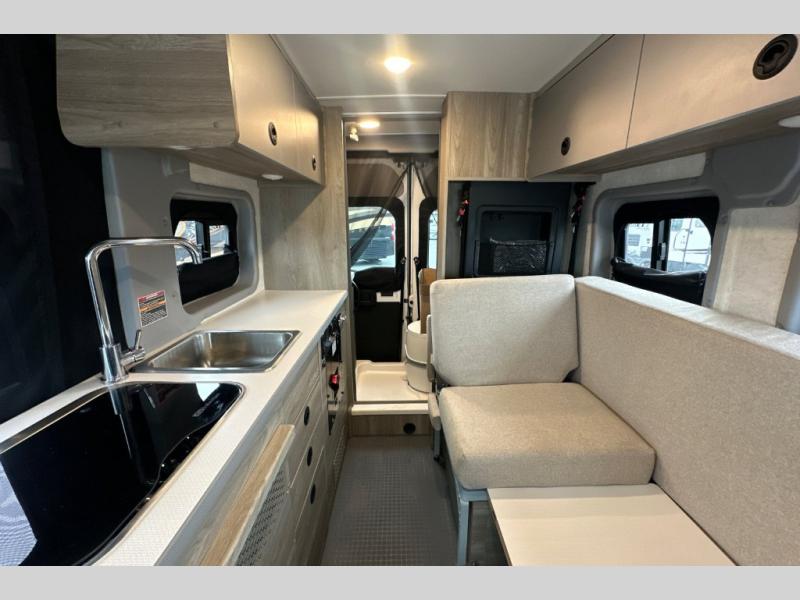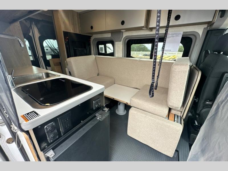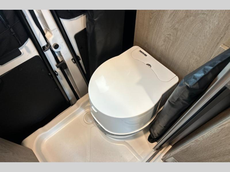 This camper van is perfect for independent travel or if you've got a camping partner to take along with you! The convertible dinette bed can transform into a twin-size bed for one or a double-size bed for two. And the optional pop-top sleeping area can be added if you're needing more sleeping space The three seating modes include a belt mode, sofa mode, or lounge mode for even more comfort. You will find all you need in the kitchen to prepare meals each day, including a two burner range with a glass cover for more counter space and a 3.0 cu. ft. 12V single door compressor-driven refrigerator/freezer for food storage. There is a shower with a wall surround in the rear wet bath, along with a removable cassette toilet, a medicine cabinet with a mirror, and a wardrobe cabinet with added storage. This space could also be used as a mudroom after a day of exploring, or utilize it for storage!