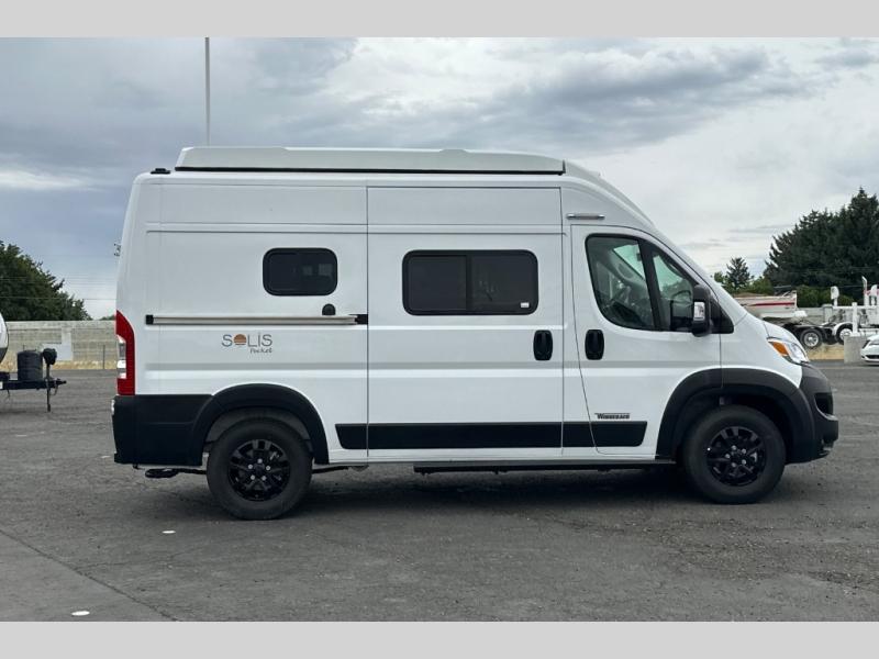 If you want the versatility for your backcountry excursions, and the ability to navigate urban areas, then you need one of these Winnebago Solis Pocket Class B gas motorhomes! A Ram ProMaster 3.6L V6 gas engine with 280HP and a 9-speed automatic transmission power these units to your greatest adventures. Some cab conveniences you will appreciate while driving include a radio/rear view monitor system touch screen, pedestrian automatic emergency braking system, and captain chairs that can slide/swivel/recline and have adjustable headrests. Zippered window coverings give you extra privacy and the heavy duty vinyl flooring throughout is sure to hold up through all of your adventures. A rod and privacy screen is provided for the rear annex to hang your wet clothes or even use as an outdoor shower. Navigate your next adventure with a Solis Pocket!