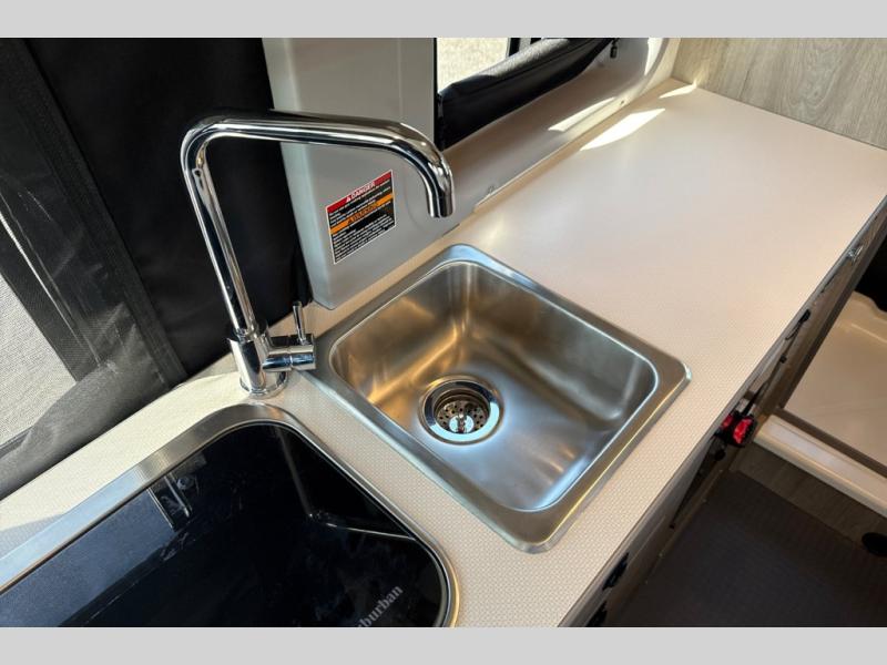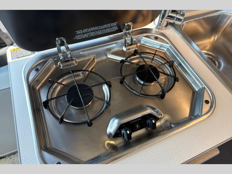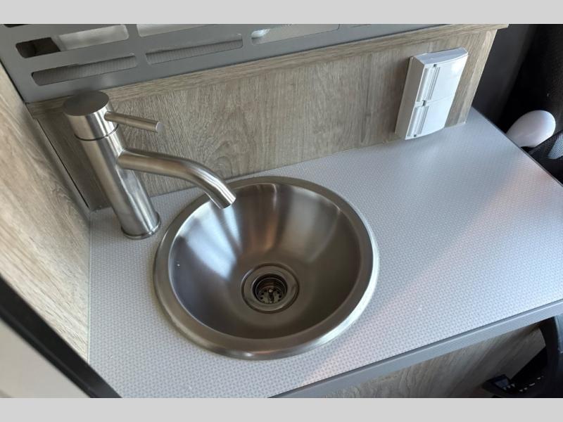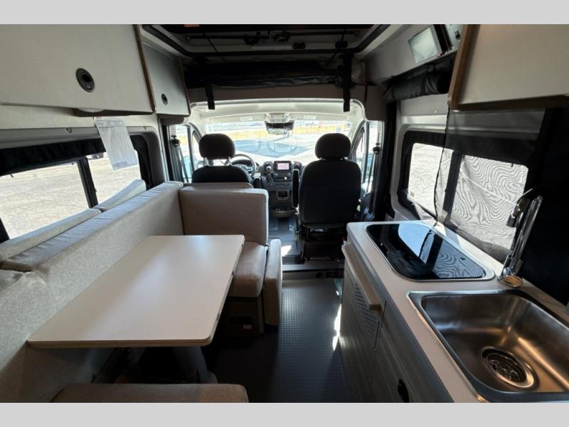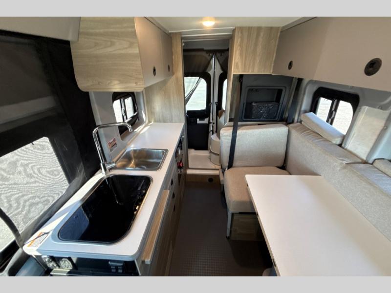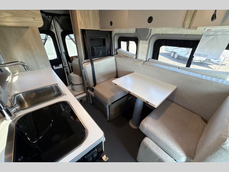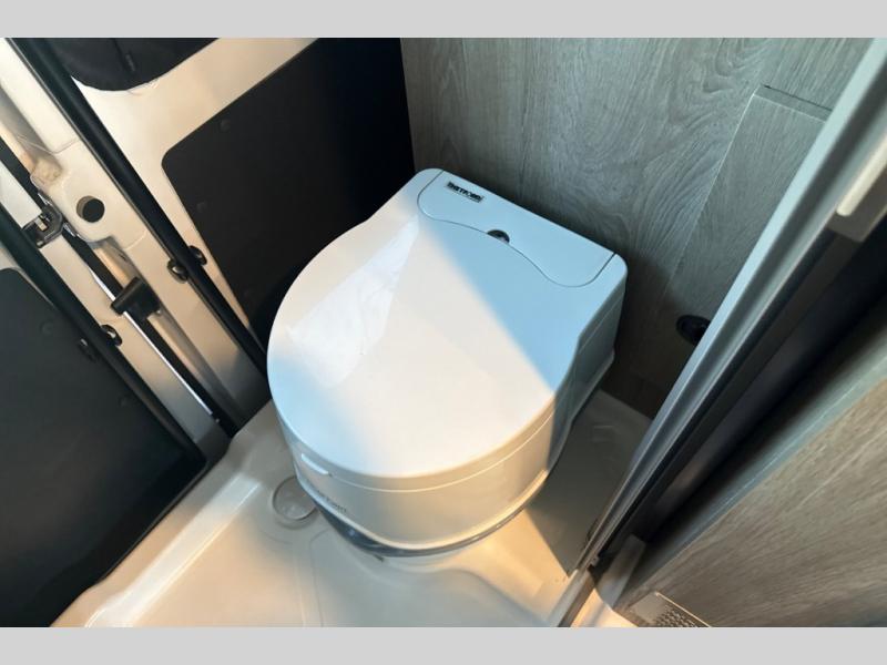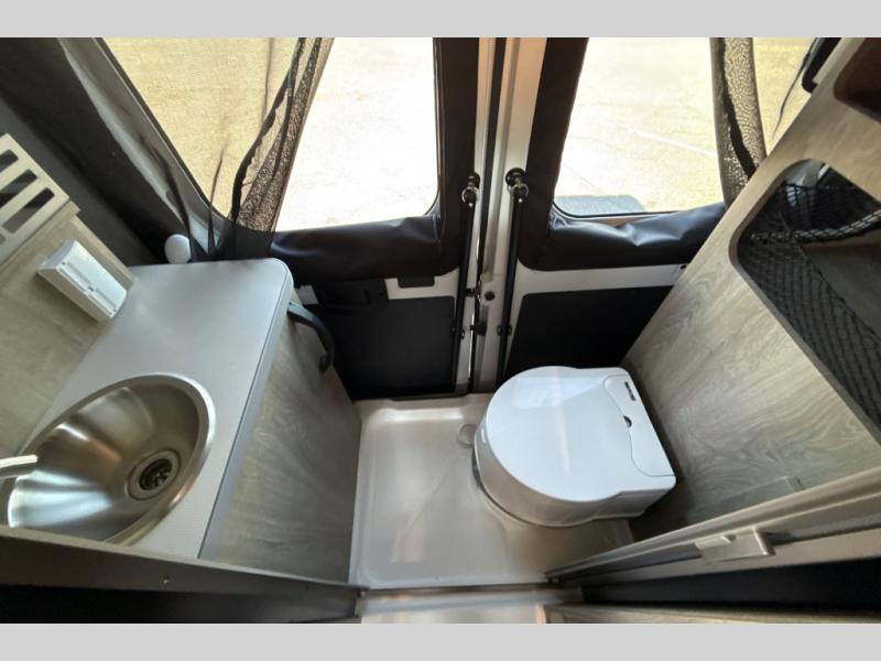 This camper van is perfect for independent travel or if you've got a camping partner to take along with you! The convertible dinette bed can transform into a twin-size bed for one or a double-size bed for two. And the optional pop-top sleeping area can be added if you're needing more sleeping space The three seating modes include a belt mode, sofa mode, or lounge mode for even more comfort. You will find all you need in the kitchen to prepare meals each day, including a two burner range with a glass cover for more counter space and a 3.0 cu. ft. 12V single door compressor-driven refrigerator/freezer for food storage. There is a shower with a wall surround in the rear wet bath, along with a removable cassette toilet, a medicine cabinet with a mirror, and a wardrobe cabinet with added storage. This space could also be used as a mudroom after a day of exploring, or utilize it for storage!