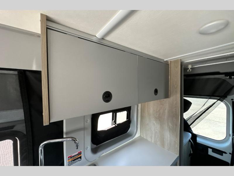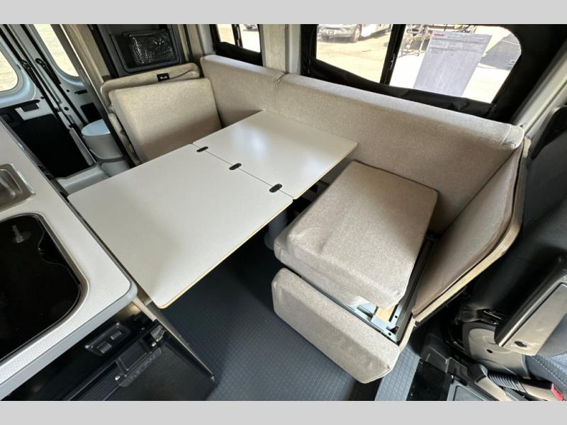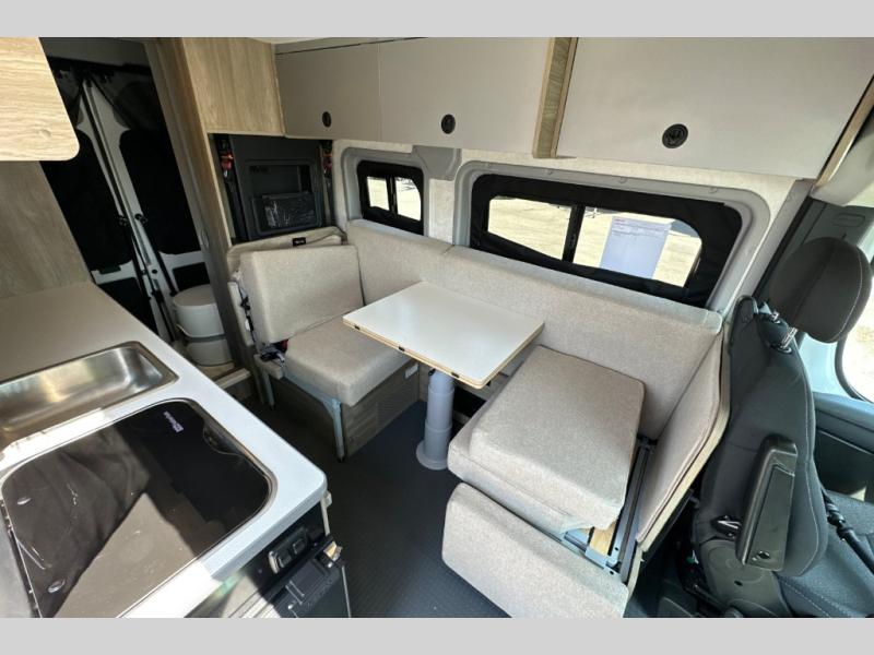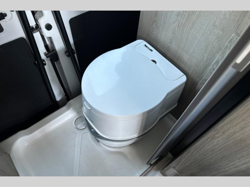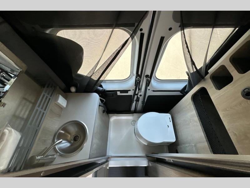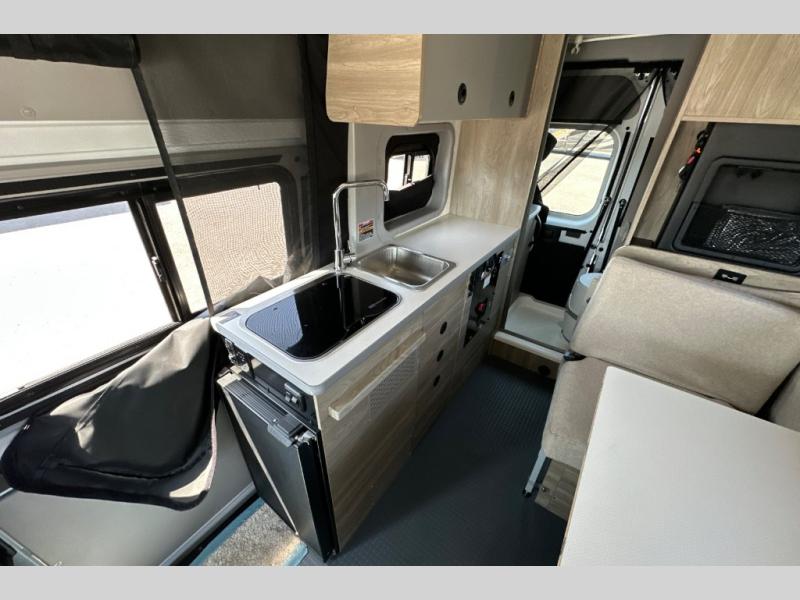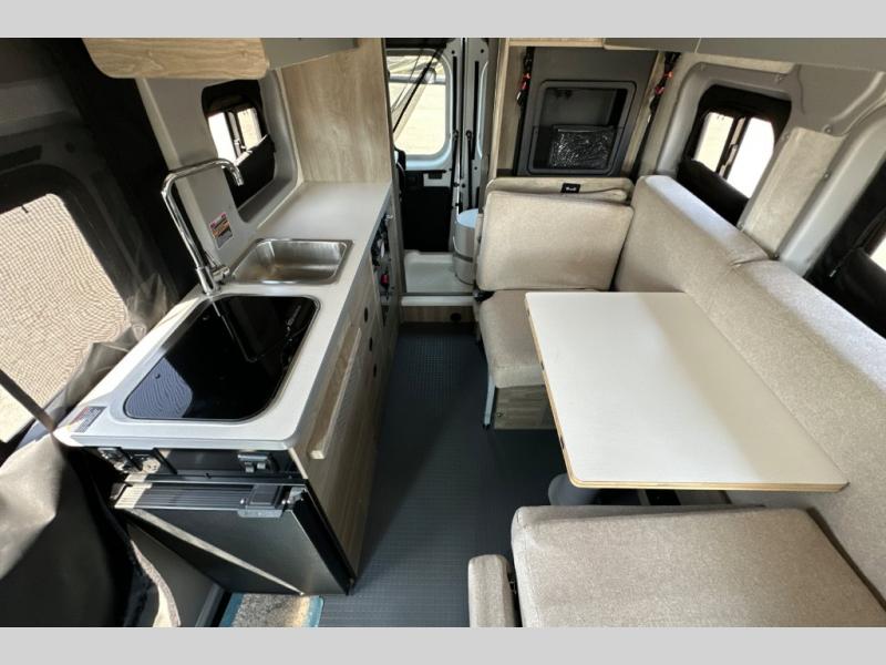 This camper van is perfect for independent travel or if you've got a camping partner to take along with you! The convertible dinette bed can transform into a twin-size bed for one or a double-size bed for two. And the optional pop-top sleeping area can be added if you're needing more sleeping space The three seating modes include a belt mode, sofa mode, or lounge mode for even more comfort. You will find all you need in the kitchen to prepare meals each day, including a two burner range with a glass cover for more counter space and a 3.0 cu. ft. 12V single door compressor-driven refrigerator/freezer for food storage. There is a shower with a wall surround in the rear wet bath, along with a removable cassette toilet, a medicine cabinet with a mirror, and a wardrobe cabinet with added storage. This space could also be used as a mudroom after a day of exploring, or utilize it for storage!