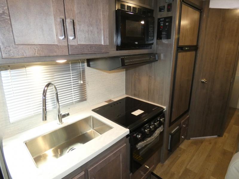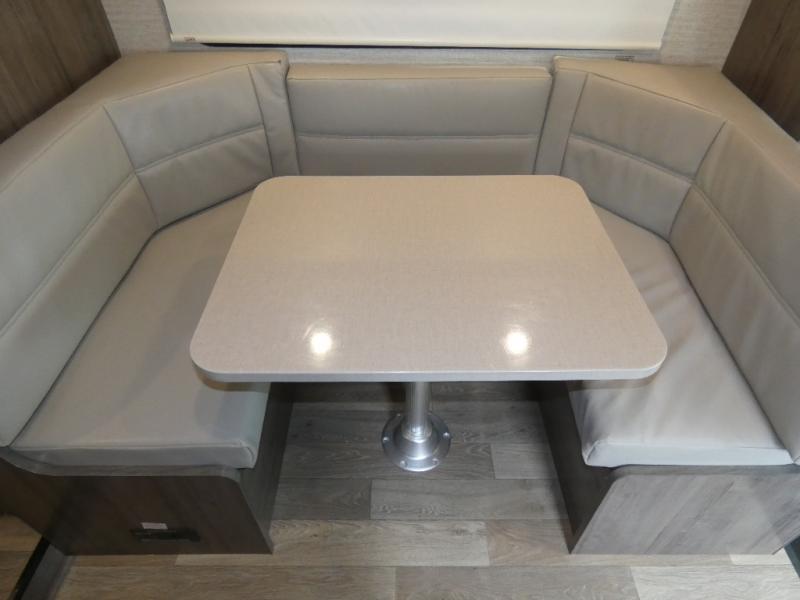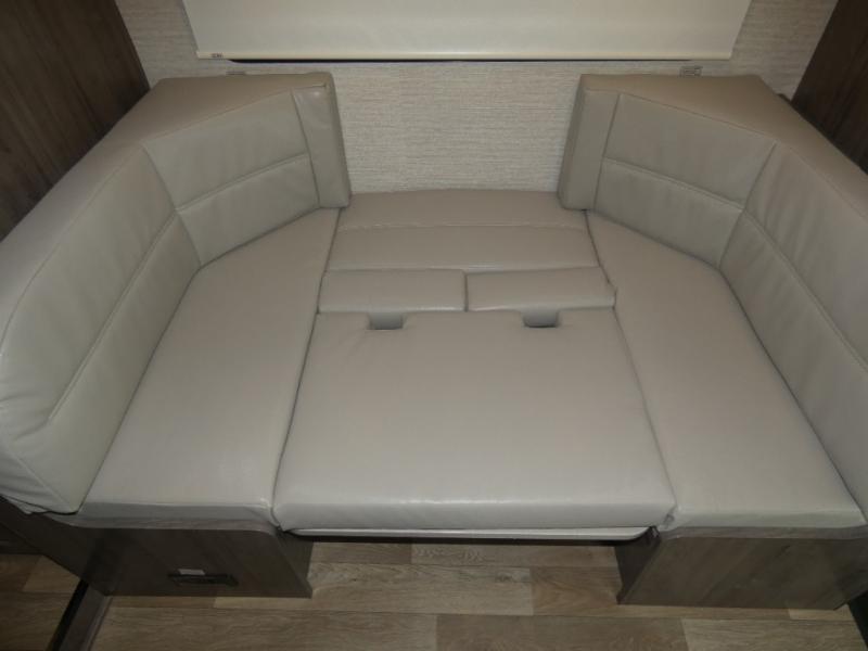 Your crew of five will love traveling and camping in this cozy coach. Once you arrive at the campground, the cook can prepare lunch on the three burner cooktop, or use the microwave oven if you're wanting something quick. If you need to freshen up from driving all day, there is a 23" x 34" shower in the full bath, plus a shower skylight and a medicine cabinet where you'll find your necessities. This model includes a U-shaped dinette that will be perfect for meal times, a game of Monopoly, and additional sleeping space, or you may just find yourselves outdoors under the 14' power awning with LED lights. And don't overlook the storage space in this model with a bedroom wardrobe, a kitchen pantry, plus a large lighted trunk storage for larger camp gear!