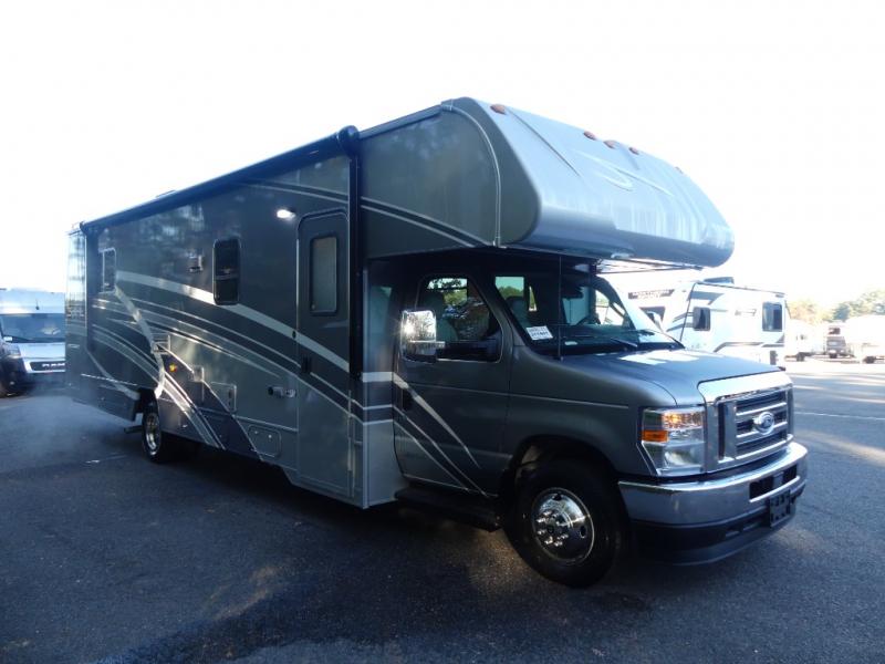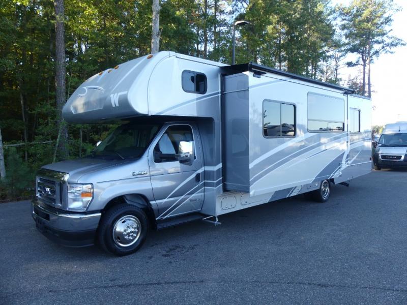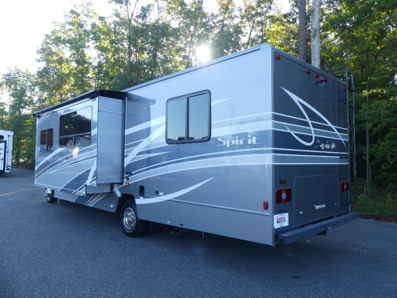 Each Spirit Class C gas motorhome by Winnebago features a powerful 7.3L V8 premium engine with a durable Ford E450 chassis. The exterior is eye-catching with its premium high-gloss fiberglass skin, along with the molded front cap. Your journey will be made enjoyable by the multi-adjustable slide/recline cab seats, and the radio/rearview monitor system includes an 8.95" multi-function touchscreen with a rear color camera for easy maneuvering in and out of campgrounds. Each model includes Corian solid surface countertops, vinyl flooring throughout, black-out roller shades, plus many more comforts you won't want to camp without!