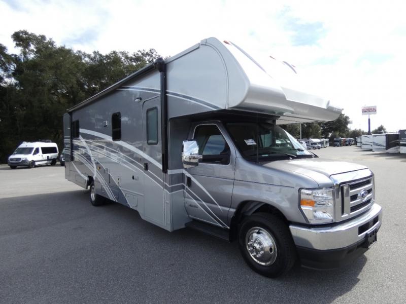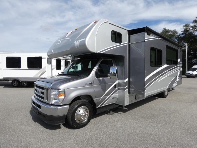Each Spirit Class C gas motorhome by Winnebago features a powerful 7.3L V8 premium engine with a durable Ford E450 chassis. The exterior is eye-catching with its premium high-gloss fiberglass skin, along with the molded front cap. Your journey will be made enjoyable by the multi-adjustable slide/recline cab seats, and the radio/rearview monitor system includes an 8.95" multi-function touchscreen with a rear color camera for easy maneuvering in and out of campgrounds. Each model includes Corian solid surface countertops, vinyl flooring throughout, black-out roller shades, plus many more comforts you won't want to camp without!