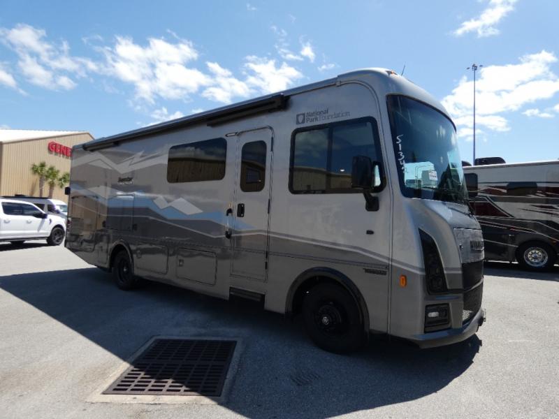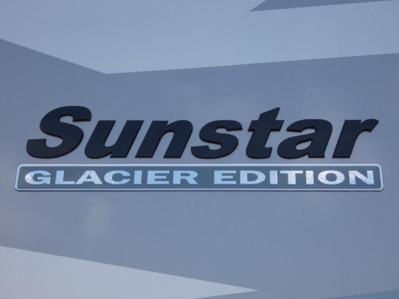 The Winnebago Sunstar National Park Foundation Limited Edition Class A gas motorhome offers a large panoramic windshield so you can easily see where the road takes you. Black painted wheels enhance the exterior look, which also features frameless tinted windows, side storage doors with paddle latches, and a bat wing awning. You'll be prepared for any weather with the 35,000 BTU furnace or the 15,000 BTU A/C. A Cummins Onan MicroQuiet gas generator, Lithionics lithium house battery, and three solar mounted roof panels provide for all your power needs. You're ready to take on the National Parks in this one!