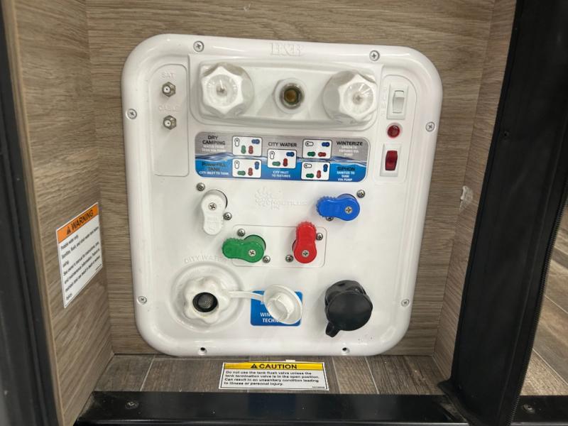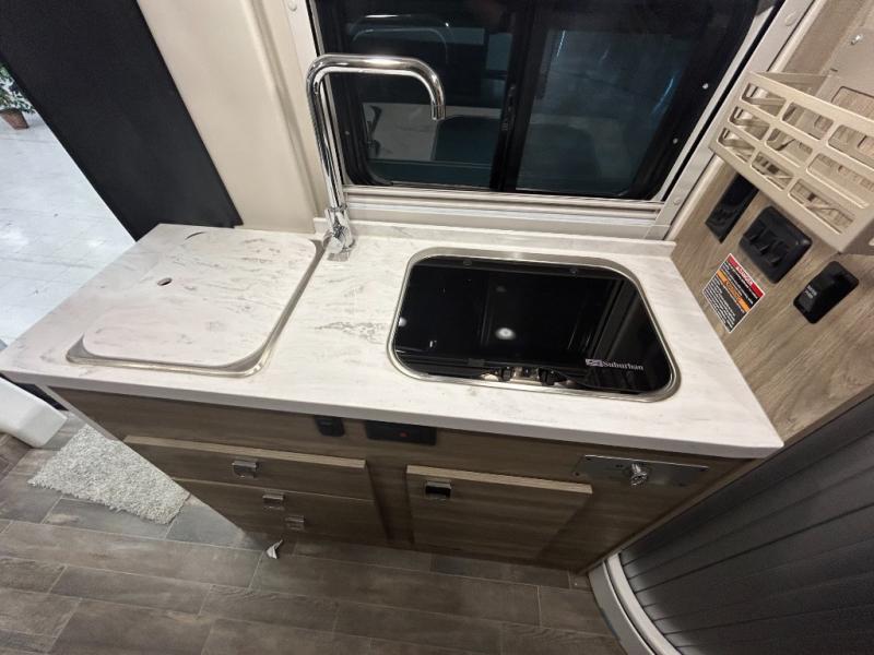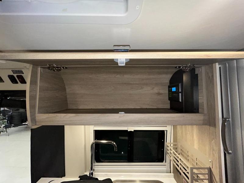 Experience the comforts of home while traveling on the road with this motorhome! You can roll out of the corner 49" x 77" bed then easily exit through the rear double doors to catch the beautiful sunrise. Freshen up in the 28" x 51" wet bath with a sliding door then head to the kitchen and grab some eggs from the two door 6.0 cu. ft. compressor-driven refrigerator/freezer then fry them on the two burner range top with glass cover and heat shield. The flip-up countertop extension will make your meal prepping easier and the cold water filtration system ensures you have clean water where ever you go. The two cab seats in the living area have an adjustable/removable table and mount to enjoy your meals at, and next to the passenger captain chair is a pedestal with pop-up outlets and mount for the adjustable/removable table. This model also includes a 2,800-watt gas generator to power your adventures!