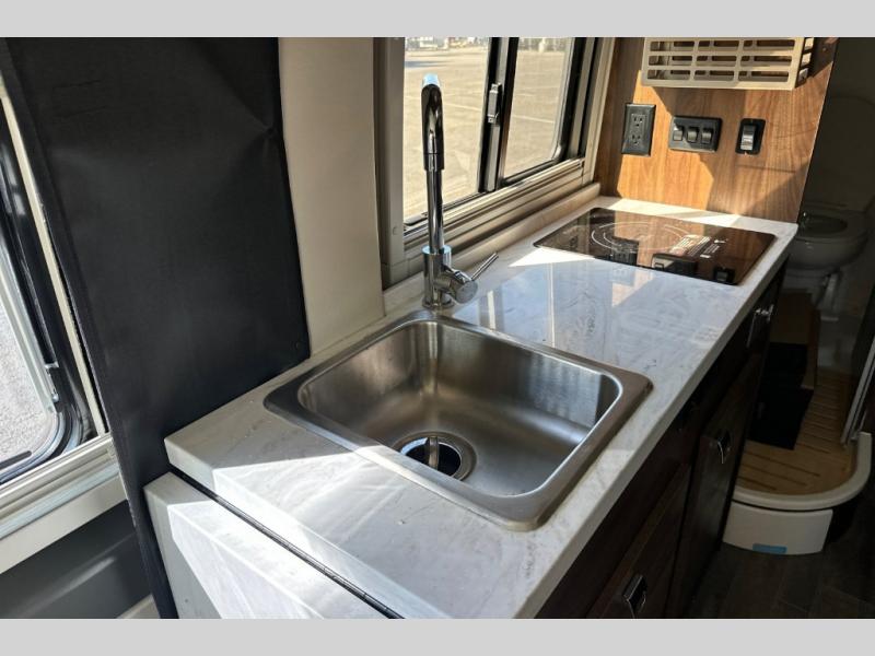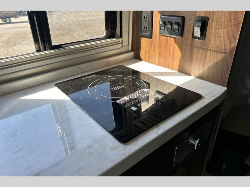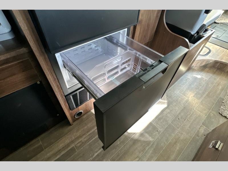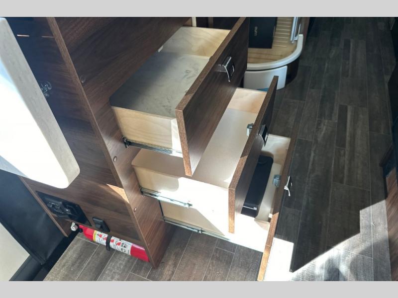 This motorhome has everything you need for a comfortable trip! You can roll out of the corner 49" x 77" bed then easily exit through the rear double doors to catch the beautiful sunrise. Freshen up in the 28" x 51" wet bath with a sliding door then head to the kitchen and grab some eggs from the two door 6.0 cu. ft. compressor-driven refrigerator/freezer then fry them on the single burner induction cooktop. The flip-up countertop extension will make your meal prepping easier and the cold water filtration system ensures you have clean water where ever you go. The two cab seats in the living area have an adjustable/removable table and mount to enjoy your meals. This model also comes with the Pure3 energy management system which has a 3-module lithium-ion energy pack, 3,200 watt inverter, a Bluetooth control module, an energy pack heating system, and a second dedicated alternator powered by the chassis engine!