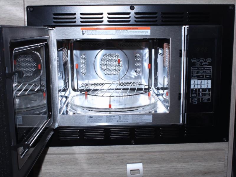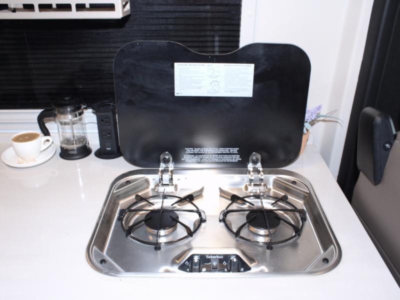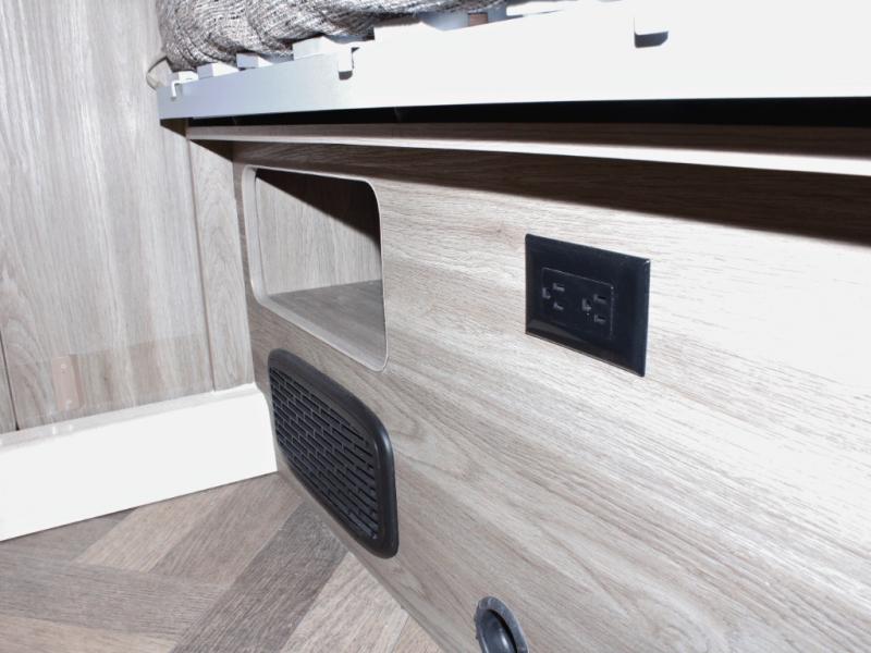 Forget fast food—your kitchen includes a two-burner range with glass cover, 4.3 cu. ft. compressor fridge/freezer, and flip-up counter extension for added prep space. Paired with a 2,800-watt Cummins Onan generator, this coach is fully capable of off-grid living. Want more power? Opt into solar upgrades or lithium packages to go even farther off the beaten path.