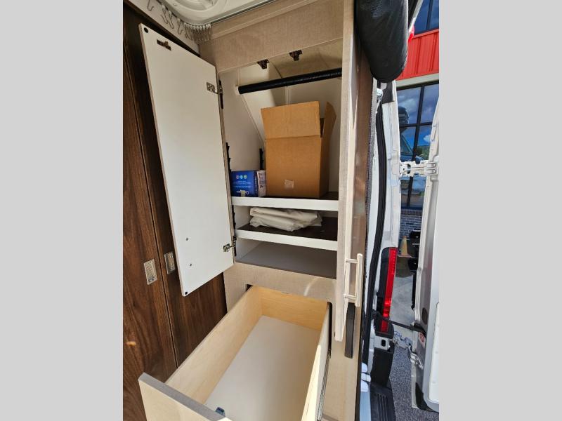 The 2025 Travato 59K blends maneuverability and comfort, offering a fully self-contained solution for couples or solo travelers who crave the open road. With its convertible twin bed setup, practical rear wet bath, and off-grid power, this compact Class B makes adventure easy without sacrificing the comforts of home.