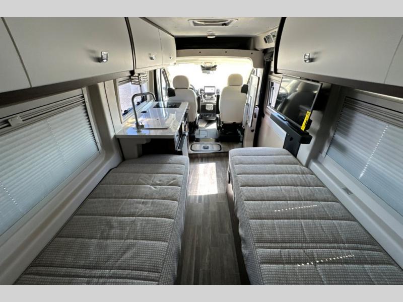 Don't pass up your chance to travel in true luxury with this motorhome! After a long day of traveling, you can rest up on one of the two twin beds which can be converted into a 74" x 76" bed with the flex bed system. Freshen up in the rear 25" x 43" wet bath with a fold down lavatory sink and a wardrobe to store your clothes and towels, plus sliding doors for privacy. You don't have to eat fast food while on the road either thanks to the single burner induction cooktop and single door 4.3 cu. ft. compressor-driven refrigerator/freezer, plus you have a flip-up countertop extension to make your meal prepping easier. The adjustable/removable table and mount makes it easy to eat your meals in different areas of the motorhome too. This model also comes with the Pure3 energy management system which has a 3-module lithium-ion energy pack, 3,200 watt inverter, a Bluetooth control module, an energy pack heating system, and a second dedicated alternator powered by the chassis engine!