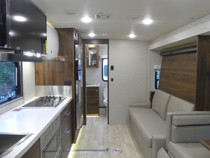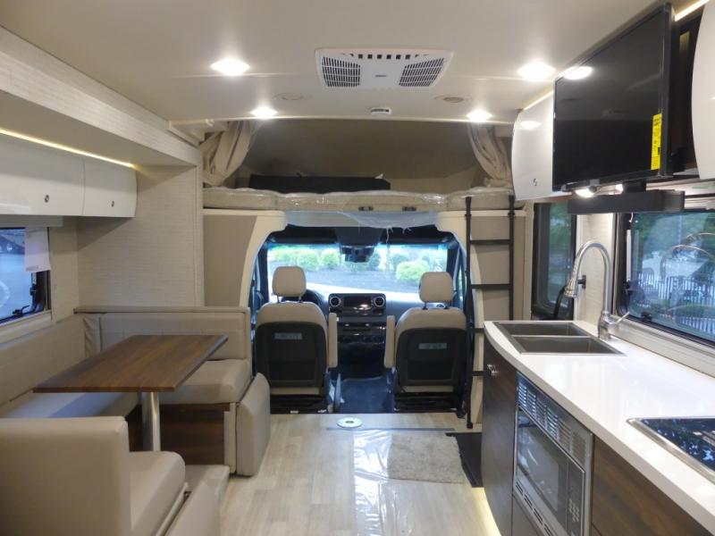 A couple or family will enjoy the look of the interior each time they take this View Class C diesel motorhome on the road. You will be able to easily set up the queen Murphy+ bed when it's time for bedtime while the kids sleep on the bunk above the cab or the U-shaped dinette. Everyone can get cleaned up in the full rear bathroom that has a space-saving sliding door before making meals with full kitchen amenities including a convection microwave/oven.