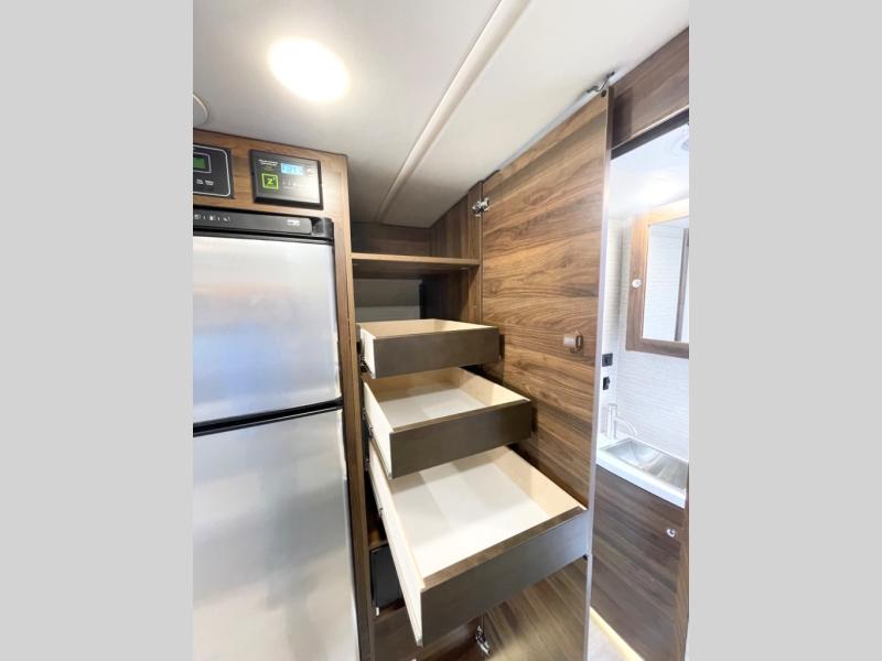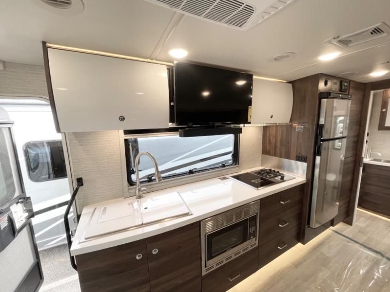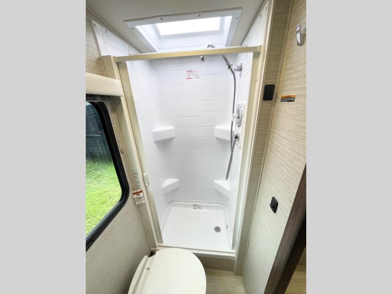 A couple or family will enjoy the look of the interior each time they take this View Class C diesel motorhome on the road. With the curved cabinets, the lighted soft-close galley drawers, and the sprung-cushion dinette and sofa seats, there will surely be a favorite feature for everyone. You will be able to easily set up the queen Murphy+ bed when it's time for bedtime while the kids sleep on the bunk above the cab or the U-shaped dinette. You might like to add the theater seating option with swivel tables if you don't need that extra sleeping space. Everyone can get cleaned up in the full rear bathroom that has a space-saving sliding door before making meals with full kitchen amenities including a convection microwave/oven.