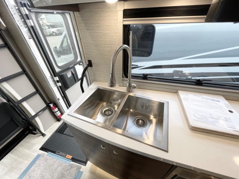 With each View Class C diesel motorhome by Winnebago, you can extend your trips off grid with the industry-leading holding tanks, the two 100W solar panels, the two deep-cycle Group 31 RV batteries, the 2,000W inverter, plus the 3,600W Cummins Onan MicroQuiet LP generator. The insulated sleeper deck is built with premium thermal and acoustic insulation allowing the SuperShell sleeper deck to be more comfortable and relaxing during any season. The View is built on a Mercedes-Benz Sprinter chassis with advanced safety features giving you peace of mind, and the MBUX touchscreen infotainment system has intelligent voice control, navigation, a Wi-Fi hotspot, and more! The interior offers luxury space and simple solutions for storage, plus it also has vinyl flooring and laminate countertops for easy clean-up.