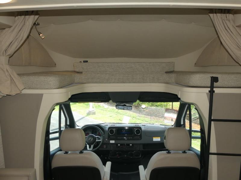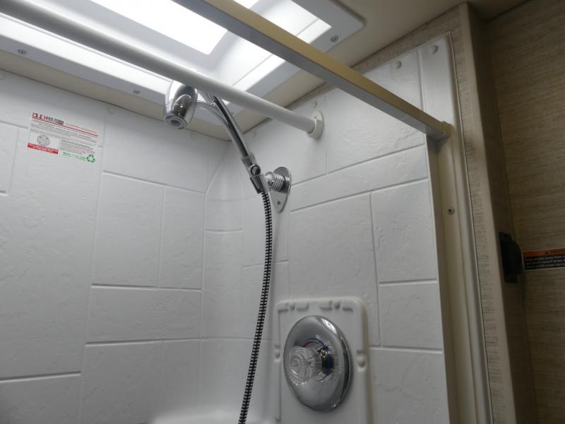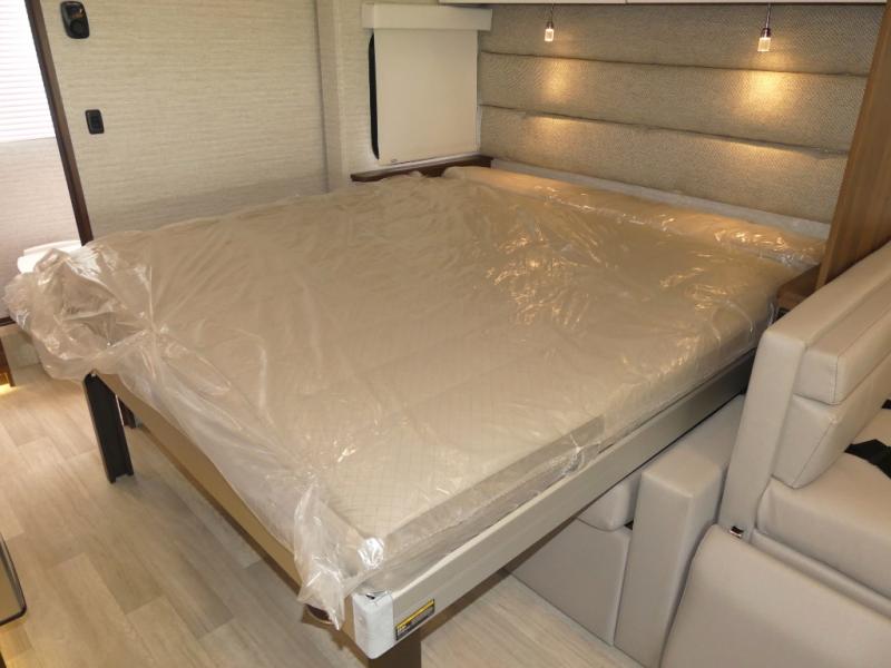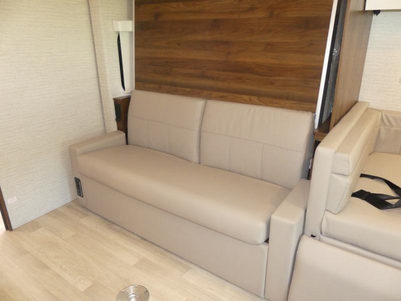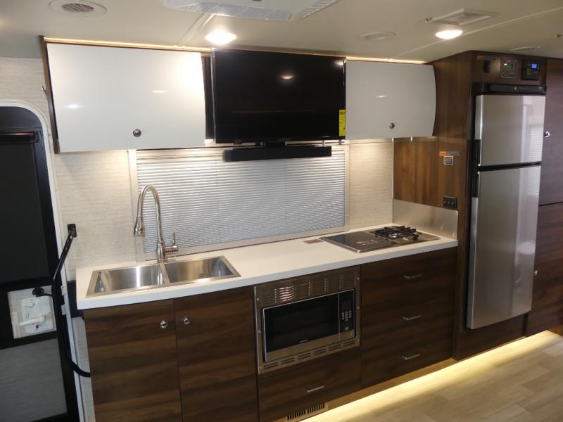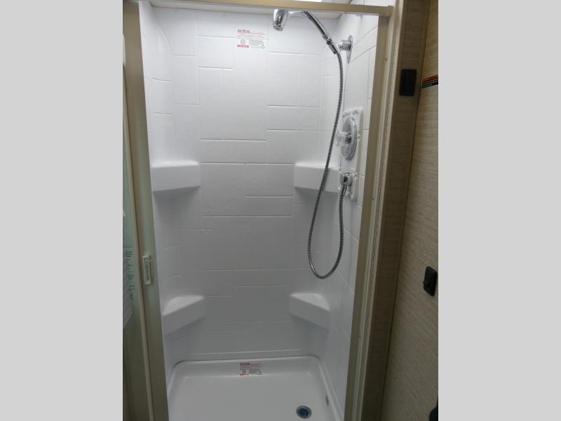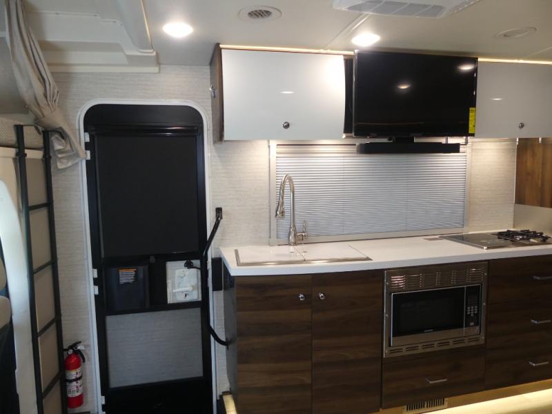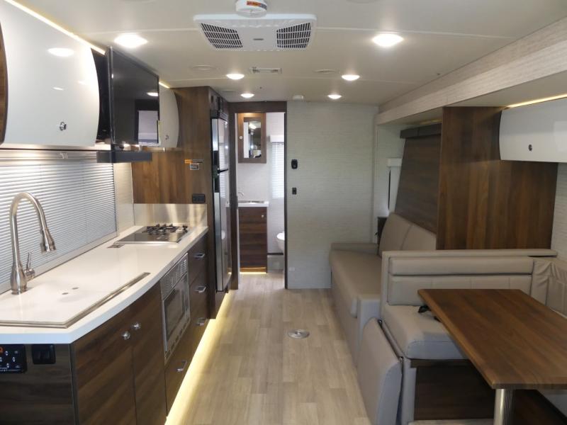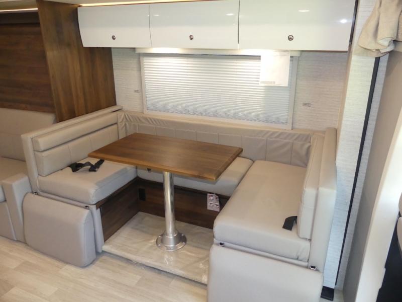 A couple or family will enjoy the look of the interior each time they take this View Class C diesel motorhome on the road. You will be able to easily set up the queen Murphy+ bed when it's time for bedtime while the kids sleep on the bunk above the cab or the U-shaped dinette. Everyone can get cleaned up in the full rear bathroom that has a space-saving sliding door before making meals with full kitchen amenities including a convection microwave/oven.