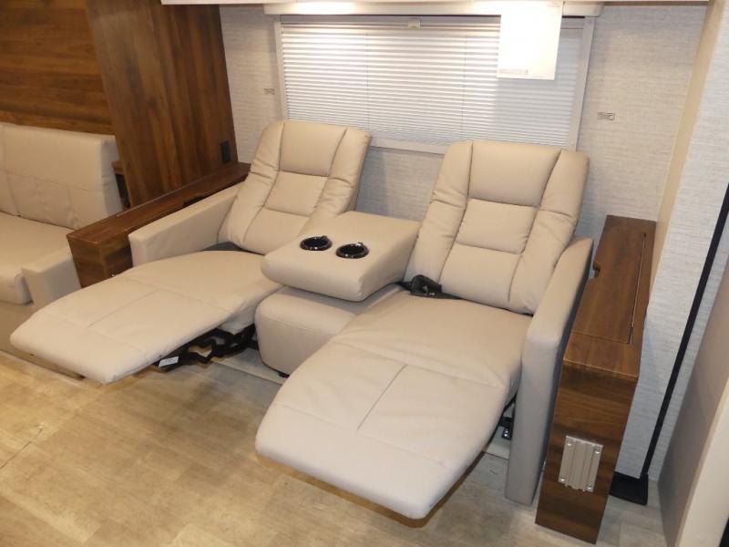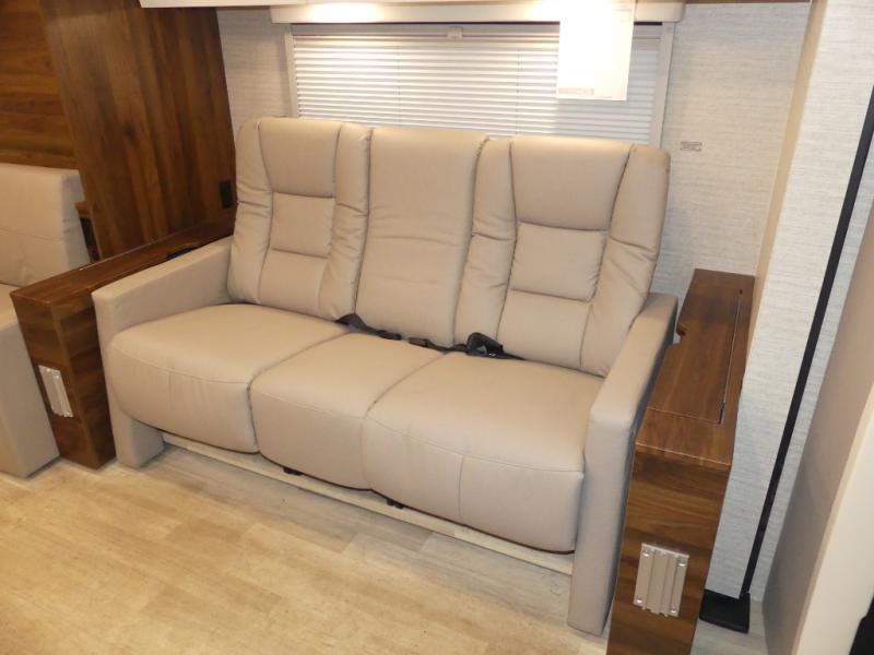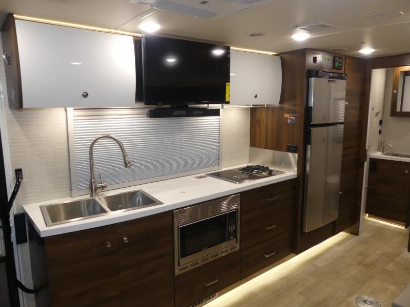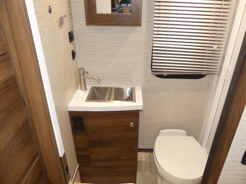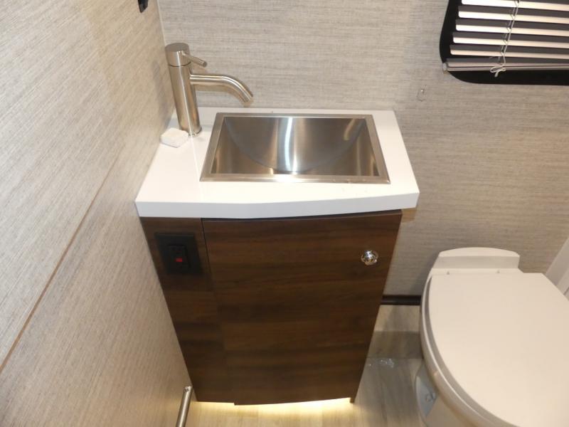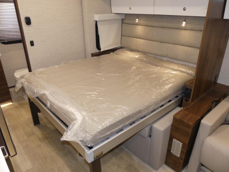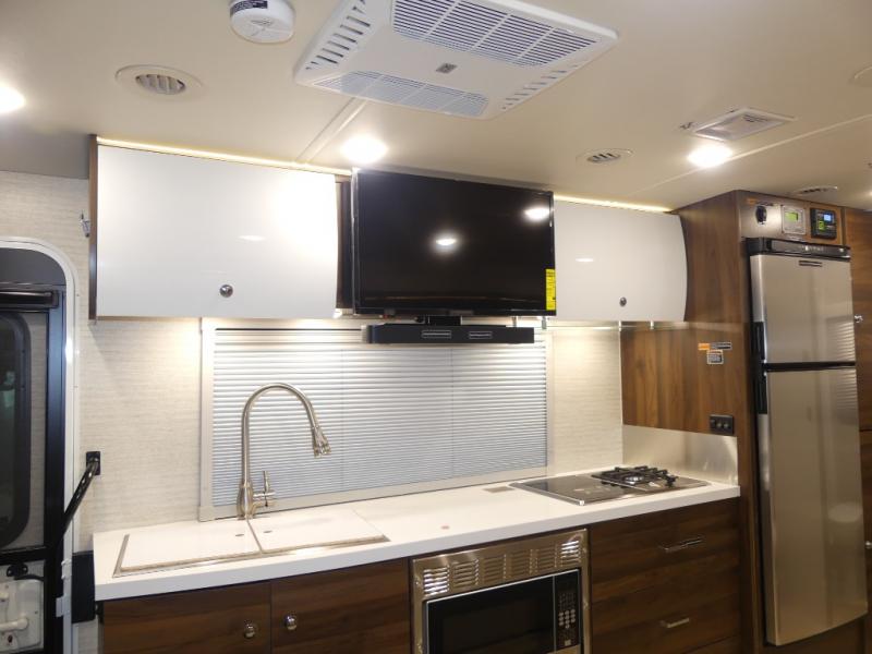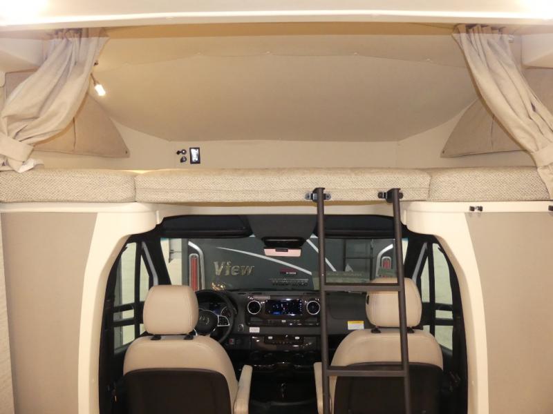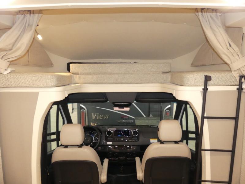 A couple or family will enjoy the look of the interior each time they take this View Class C diesel motorhome on the road. You will be able to easily set up the queen Murphy+ bed when it's time for bedtime while the kids sleep on the bunk above the cab. Everyone can get cleaned up in the full rear bathroom that has a space-saving sliding door before making meals with full kitchen amenities including a convection microwave/oven.