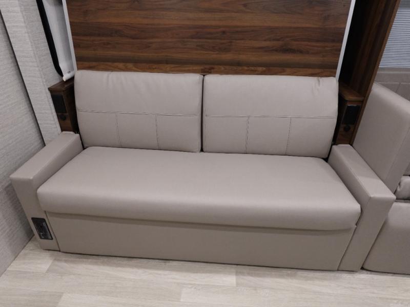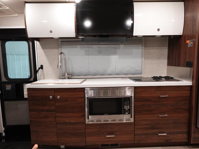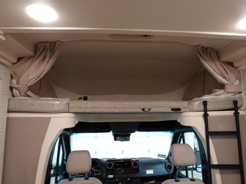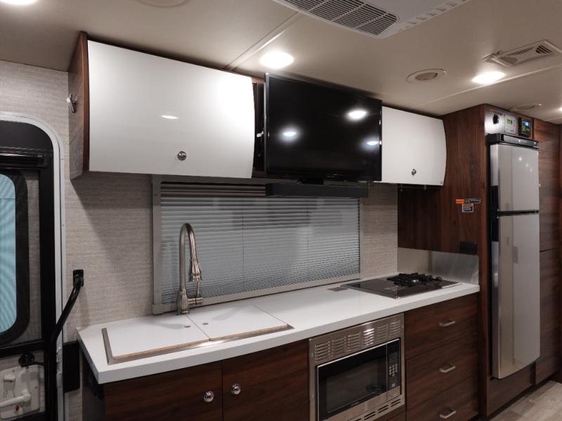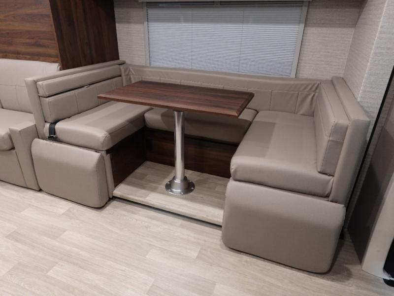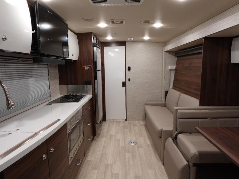 A couple or family will enjoy the look of the interior each time they take this View Class C diesel motorhome on the road. You will be able to easily set up the queen Murphy+ bed when it's time for bedtime while the kids sleep on the bunk above the cab or the U-shaped dinette. You might like to add the theater seating option with swivel tables if you don't need that extra sleeping space. Everyone can get cleaned up in the full rear bathroom that has a space-saving sliding door before making meals with full kitchen amenities including a convection microwave/oven.