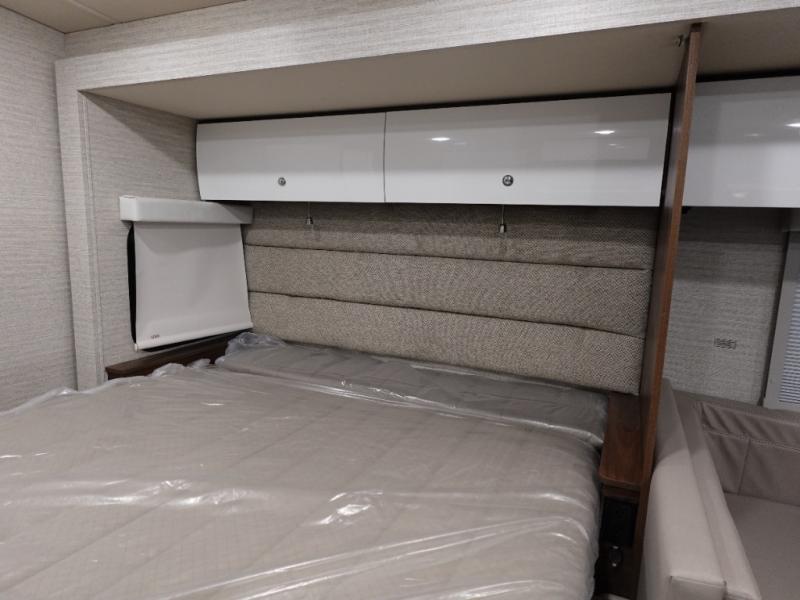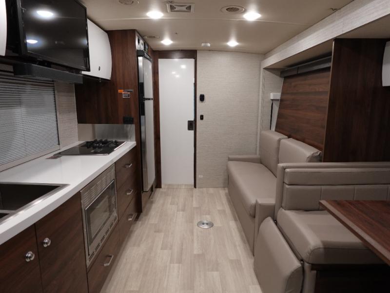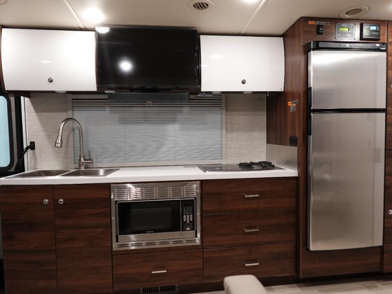A couple or family will enjoy the look of the interior each time they take this View Class C diesel motorhome on the road. You will be able to easily set up the queen Murphy+ bed when it's time for bedtime while the kids sleep on the bunk above the cab or the U-shaped dinette. Everyone can get cleaned up in the full rear bathroom that has a space-saving sliding door before making meals with full kitchen amenities including a convection microwave/oven.