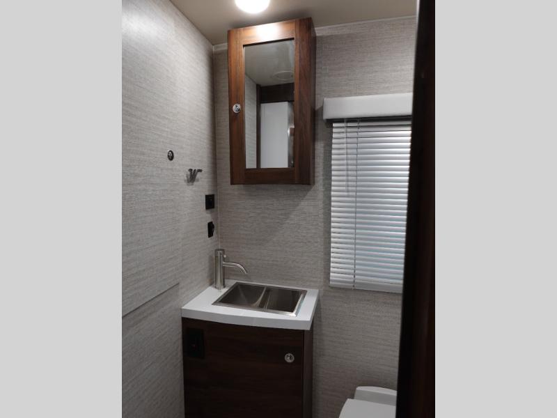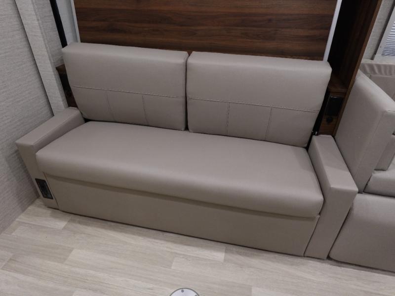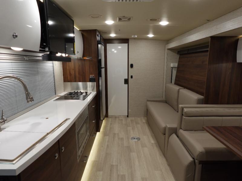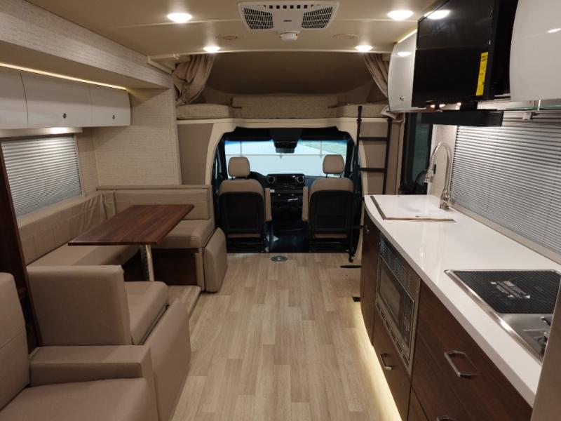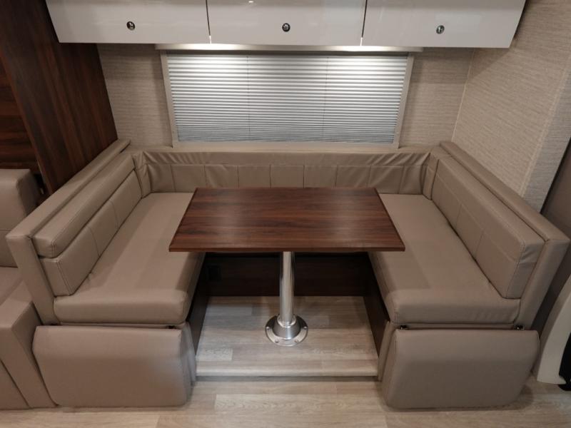 A couple or family will enjoy the look of the interior each time they take this View Class C diesel motorhome on the road. You will be able to easily set up the queen Murphy+ bed when it's time for bedtime while the kids sleep on the bunk above the cab or the U-shaped dinette. Everyone can get cleaned up in the full rear bathroom that has a space-saving sliding door before making meals with full kitchen amenities including a convection microwave/oven.