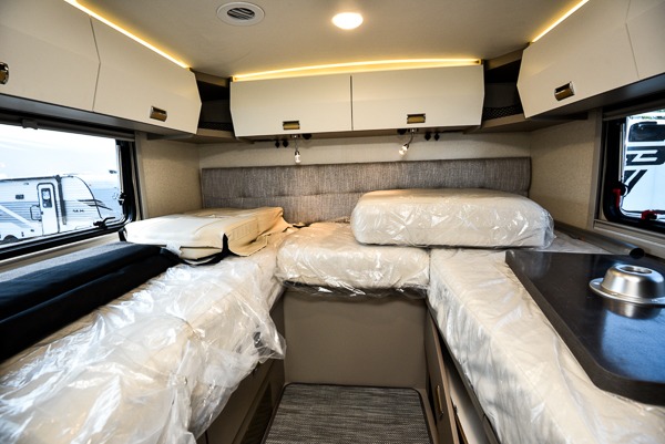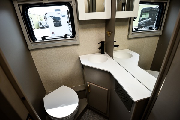 This is the perfect coach to travel with your honey or hiking buddy since there are two 32" x 76" twin beds in the back that can convert to a king-size bed if you choose! And the TrueComfort+ sofa with a movable pedestal table plus the cabover bunk will provide additional sleeping space. You can choose the optional low profile front cap with storage if you do not need the added sleeping space. An optional 3800W RVMP Flex Power generator is also available with this model. There is a 25" x 30" shower across the hall from a private toilet and sink so two people can freshen up at once. You will also be able to create meals each day since there is a two burner cooktop and convection microwave, and the 12V refrigerator will keep cold items fresh!