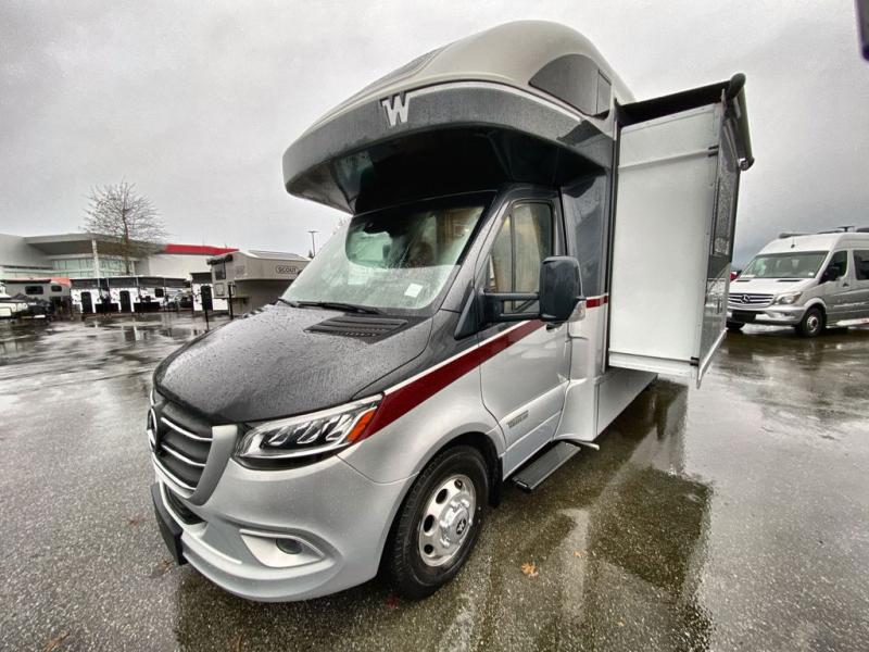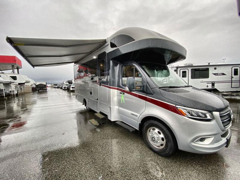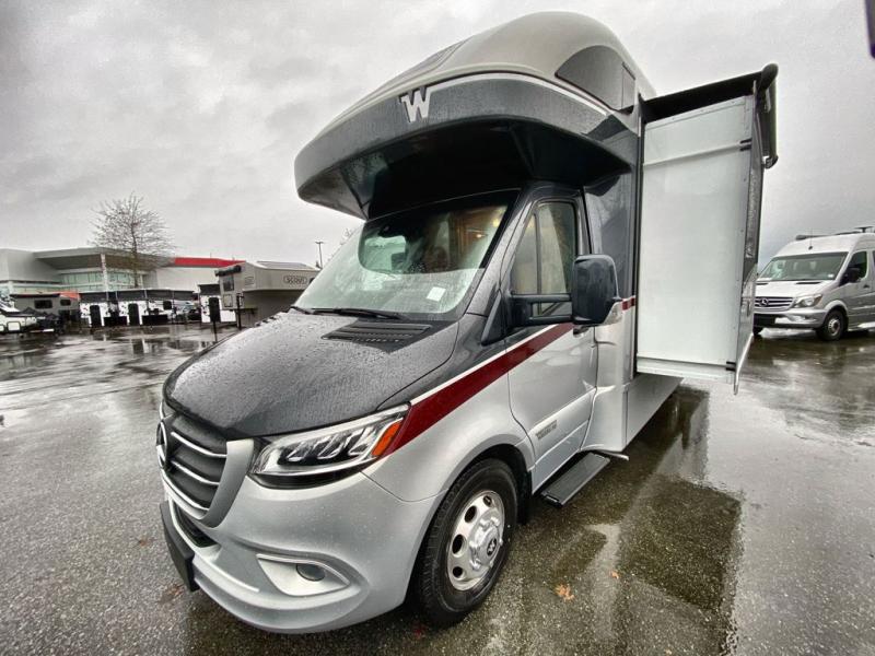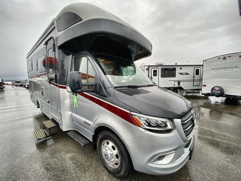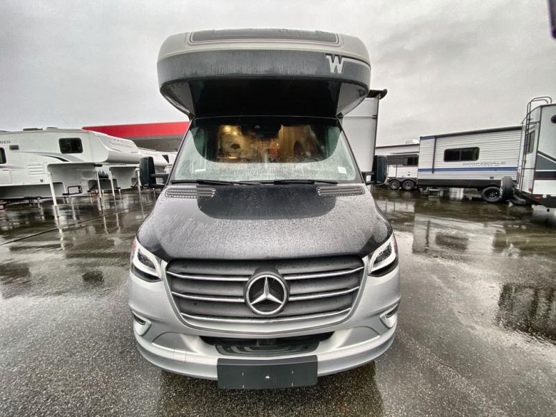 The Winnebago View 24T and 24R Class C diesel motorhome is functional, innovative, and stylish! You can rule the interstate with the Mercedes-Benz RWD Sprinter chassis, or choose the optional Mercedes-Benz AWD Sprinter chassis to tackle tougher terrain. A Lithium Power Package comes with a 320-amp-hour lithium battery and a dedicated second alternator that will allow you to charge the batteries faster while you're on the road. There are also two 120-watt solar panels to keep you going when you're off-grid. Since there is a heated gear garage with L-track cargo tie-downs, you can bring along two full-size bikes and additional gear for hiking, plus there are 110V/12V charging ports and LED lighting here for added convenience. The contemporary interior features blackout roller shades for the lounge and dining area, woven vinyl flooring throughout, and dimmable LED lighting. There is also a Winnebago Connect that is integrated into your Winnebago app that acts as your RV companion. Now you can stay informed on vehicle system alerts, travel prep resources, energy management, and more!