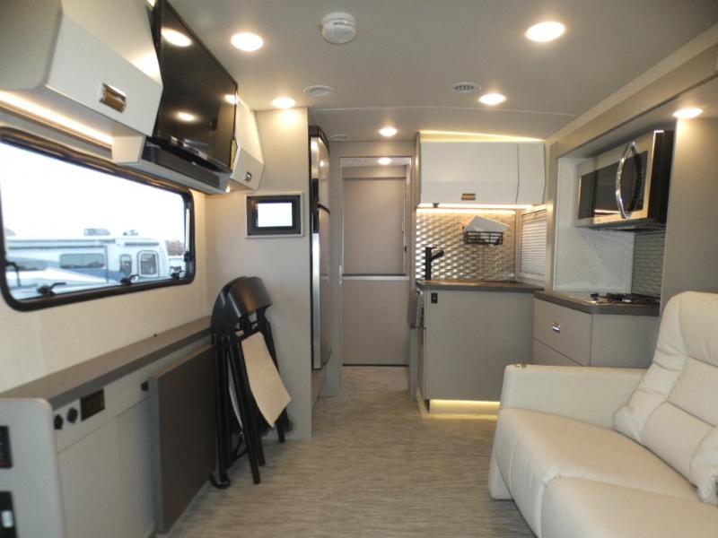 The Winnebago View 24T Class C diesel motorhome is functional, innovative, and stylish! You can rule the interstate with the Mercedes-Benz RWD Sprinter chassis. A Lithium Power Package comes with a 320-amp-hour lithium battery and a dedicated second alternator that will allow you to charge the batteries faster while you're on the road. There are also two 120-watt solar panels to keep you going when you're off-grid. Since there is a heated gear garage with L-track cargo tie-downs, you can bring along two full-size bikes and additional gear for hiking, plus there are 110V/12V charging ports and LED lighting here for added convenience. The contemporary interior features blackout roller shades for the lounge and dining area, woven vinyl flooring throughout, and dimmable LED lighting. There is also a Winnebago Connect that is integrated into your Winnebago app that acts as your RV companion. Now you can stay informed on vehicle system alerts, travel prep resources, energy management, and more!